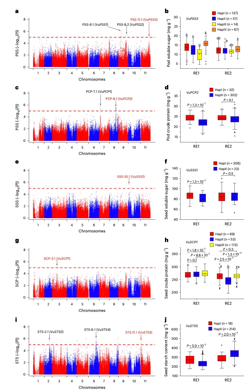 可溶性糖、總淀粉和粗蛋白質(zhì)含量是豆科作物的三個(gè)基本品質(zhì)性狀。GWAS分析檢測到三個(gè)信號(hào)與嫩莢可溶性糖含量(PSS)顯著相關(guān)(圖6a),其中VuPSS1可能是功能相關(guān)基因,VuPSS2可能通過其順式調(diào)控元件影響PSS含量,VuPSS3-HapIV單倍型是PSS的有利單倍型。嫩莢粗蛋白含量(PCP)差異可能與有利單倍型VuPCP1-HapII和VuPCP2-HapI有關(guān)。籽??扇苄蕴牵⊿SS)含量相關(guān)的信號(hào)(圖6e)包含一個(gè)FAR1-related SEQUENCE (FAR1)家族蛋白(VuSSS1),F(xiàn)AR1在淀粉合成以及糖的運(yùn)輸和降解中起作用,VuSSS1-HapI為其有利單倍型(圖6f)。VuSCP2-HapIII和VuSCP2-HapIV通常導(dǎo)致更高的籽粒粗蛋白含量(SCP),VuSCP1和VuSCP2相似的表達(dá)模式提示它們可能影響種子發(fā)育中期的SCP表型。籽粒總淀粉含量(STS)GWAS分析檢測到5個(gè)相關(guān)信號(hào)(圖6i),STS-2.1中的VuSTS2含有一個(gè)MYB轉(zhuǎn)錄因子,STS-11.1中的VuSTS5編碼一個(gè)磷脂酰絲氨酸脫羧酶,該酶可能影響植物發(fā)育的關(guān)鍵調(diào)節(jié)因子磷脂酰絲氨酸。兩種基因的不同單倍型在兩種環(huán)境中表現(xiàn)出不同的STSs,這表明它們在很大程度上受環(huán)境條件的影響(圖6j)。STS-3.1中的VuSTS3編碼了一個(gè)未知的蛋白,其中VuSTS3-HapIII對(duì)STS的影響最大。STS-6.1含有一個(gè)NAD依賴性蛋白去乙酰化酶VuSTS4,可能影響淀粉的生物合成和調(diào)控,而VuSTS4-HapI對(duì)STS的作用更強(qiáng)。以上結(jié)果有潛力成為糧用豇豆和菜用豇豆產(chǎn)量和品質(zhì)改善的遺傳資源。