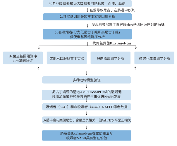 吸煙是人類最常見的不健康行為之一,世界衛(wèi)生組織將吸煙列為可預(yù)防死亡的主要原因。戒煙是延長預(yù)期壽命的最有效方法,但由于尼古丁的強大成癮性和戒斷癥狀,戒煙并不容易實現(xiàn)。尼古丁降解最近被認為是阻斷尼古丁誘發(fā)的病理的一種策略。NAFLD(非酒精性脂肪肝病)包含廣泛的病理,通常從簡單的脂肪變性發(fā)展為NASH(非酒精性脂肪性肝炎),然后在某些情況下發(fā)展為肝硬化和肝癌。由于腸道產(chǎn)生的代謝物在通過腸-肝軸的NAFLD進展中具有關(guān)鍵作用,因此建立腸道尼古丁積累、腸源性代謝物和NAFLD進展之間的關(guān)系可以為吸煙相關(guān)的肝臟疾病提供新的線索。