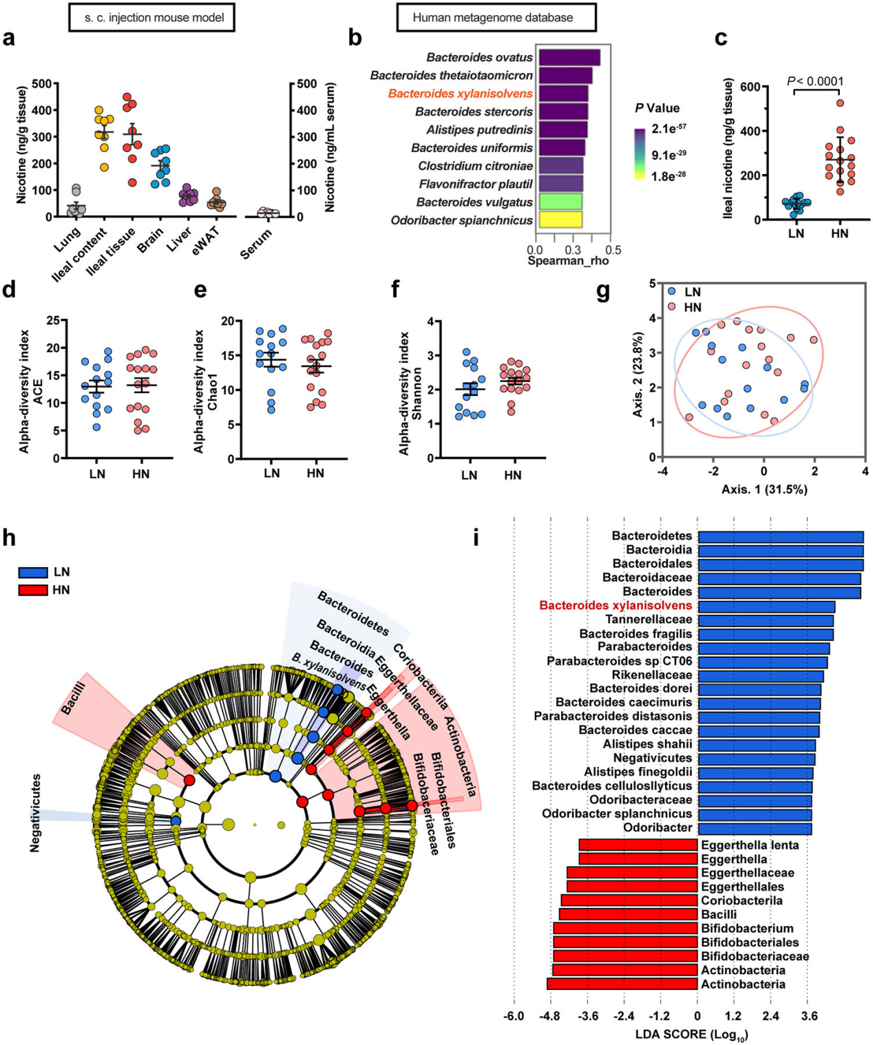 在吸煙者的回腸粘膜組織中檢測到高水平的尼古丁,表明在吸煙期間尼古丁會在腸道中積聚(圖1a)。內(nèi)源性腸道細菌有助于尼古丁的降解(圖1C)。從公共宏基因組數(shù)據(jù)庫中篩選攜帶已知尼古丁分解代謝基因的潛在菌株。在幾個菌株中發(fā)現(xiàn)了nicA基因(一種已知的尼古丁降解酶)的同源序列,表明這些菌株具有降解尼古丁的潛力。宏基因組學(xué)分析發(fā)現(xiàn)B.xylansolvens可能含有尼古丁分解代謝基因,并被鑒定為與LN和HN組之間的分離相關(guān)的主要驅(qū)動因素(圖1D),B.xylansolvens在nicX存在的情況下具有降解尼古丁的能力。