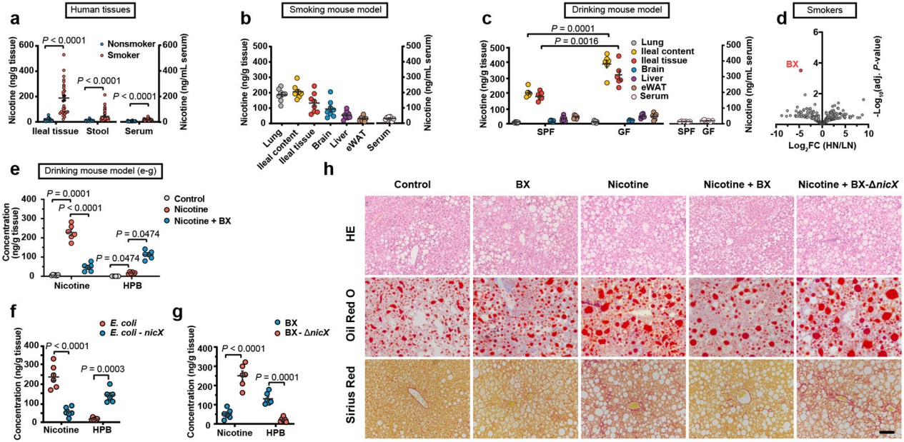該研究發(fā)現(xiàn)尼古丁在吸煙期間在腸道中積聚并加速NAFLD的進展,但它可以被人類共生菌B.xylansolvens有效降解。揭示了了腸道尼古丁積累的病理影響,并確定了一種內(nèi)源性尼古丁降解腸道細菌,該細菌對預(yù)防和治療吸煙者的NASH具有潛在價值。