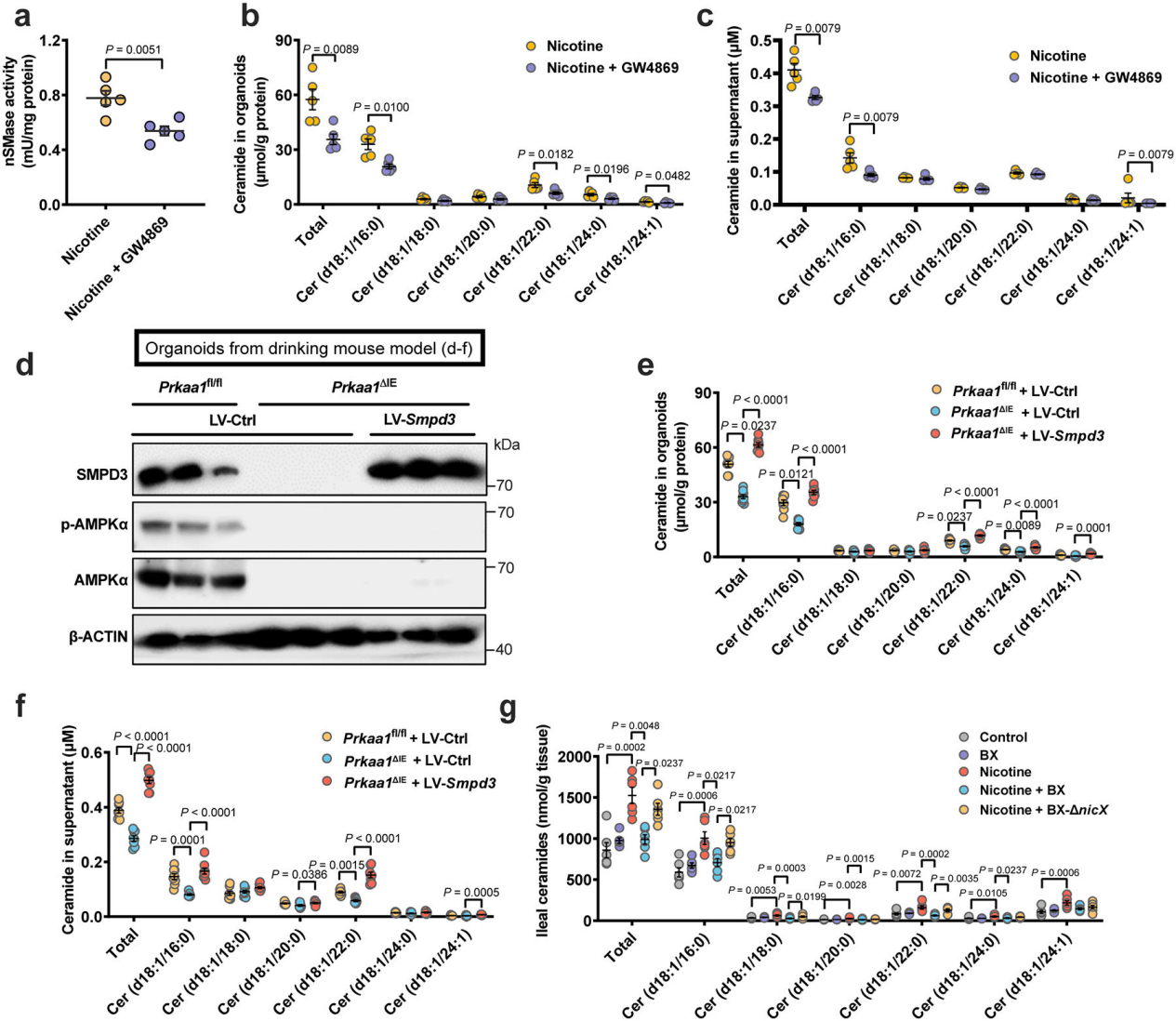 SMPD3的過表達逆轉(zhuǎn)了由于回腸器官中AMPKa1缺乏而導(dǎo)致的神經(jīng)酰胺水平的降低。在尼古丁加速的NASH小鼠模型中,在B.xylanisolvens存在的情況下,被B.xylansolvens定植的SPF小鼠回腸神經(jīng)酰胺減少。此外,口服GW4869降低了回腸神經(jīng)酰胺的水平,并且在尼古丁飲用模型中伴隨著較低的NAFLD嚴重程度。尼古丁誘導(dǎo)的腸道AMPKa-SMPD3軸的激活通過增加腸道神經(jīng)酰胺的產(chǎn)生來促進非酒精性脂肪肝的進展,因此抑制SMPD3是一種潛在的緩解肝臟脂肪變性、炎癥和纖維化的策略。