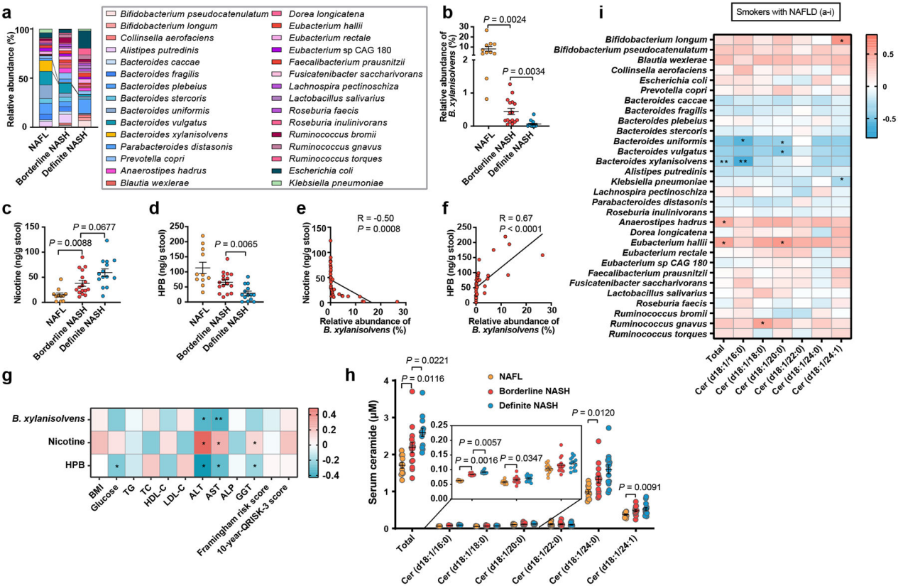 收集了83名經(jīng)活檢診斷為NAFLD患者的微生物數(shù)據(jù),將患者分為吸煙者(n=41)和非吸煙者(n=42)。這B.xylansolvens介導(dǎo)的尼古丁降解可能保護吸煙者的肝功能。NASH患者的血清神經(jīng)酰胺水平,尤其是主要來自腸道的神經(jīng)酰胺(D18:1/16:0)水平顯著高于NAFL患者(圖4h),并與B.xylansolvens的豐度呈負相關(guān)(圖4l)。綜上所述,腸道尼古丁蓄積是吸煙者臨床NAFLD進展的危險因素,同時也表明具有尼古丁降解活性的B.xylansolvens具有保護作用。