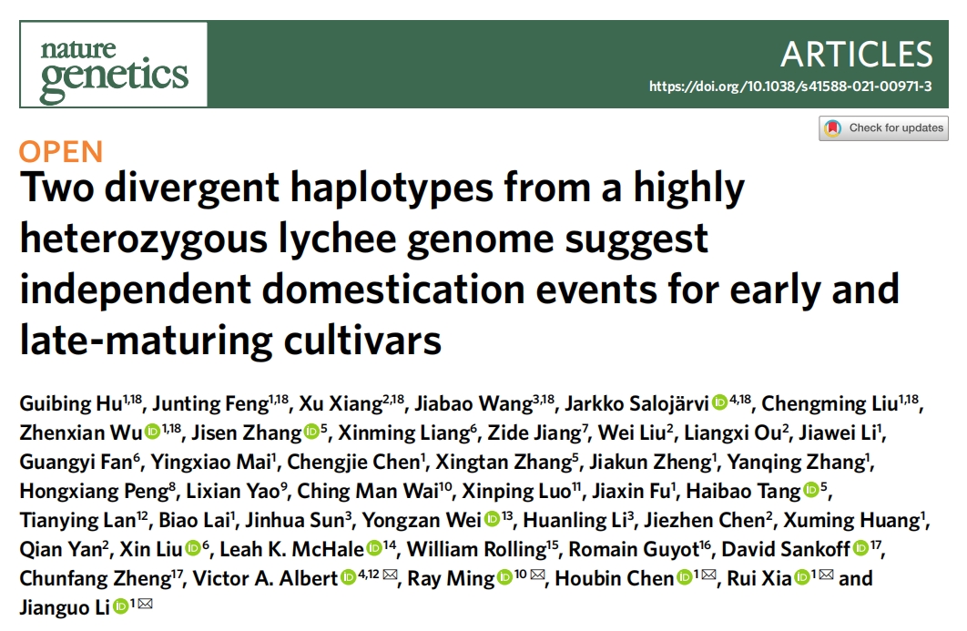 基于荔枝(Litchi chinensis)基因組的高度雜合(~2.27%),構(gòu)建了兩套高質(zhì)量妃子笑”單倍型基因組(470 Mb)。72份荔枝重測序分析發(fā)現(xiàn),來自云南的一個野生群體的極早熟荔枝品種主要與“妃子笑”的其中一個單倍型對應(yīng);來自海南的一個野生群體的晚熟荔枝品種則與另外一個單倍型對應(yīng)。早熟荔枝品種可能是極早熟荔枝品種與晚熟荔枝品種的雜交形成的,在廣東培育而成。包含一對CO-likc基因的3.7kb序列的缺失變異可能調(diào)控著不同荔枝品種間的果實成熟差異。