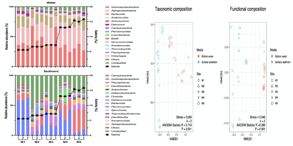 - 由于SWI對(duì)沉積細(xì)菌群落有主要影響,對(duì)M1(低鹽度)和M5(高鹽度)進(jìn)行了宏基因組測(cè)序。通過NMDS分析,沉積物細(xì)菌群落的病灶組成清晰分離;