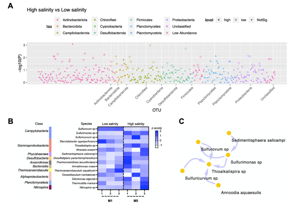 - 沉積性細(xì)菌群落中最豐富的15個(gè)細(xì)菌OTUs來自10個(gè)類別,其中彎曲桿菌和伽馬變形菌門是最重要的類群,各有3種。與此同時(shí),有11個(gè)物種在高鹽度中富集,包括硫脲、硫單胞菌、彎曲桿菌、硫堿桿菌、熱厭氧菌等;