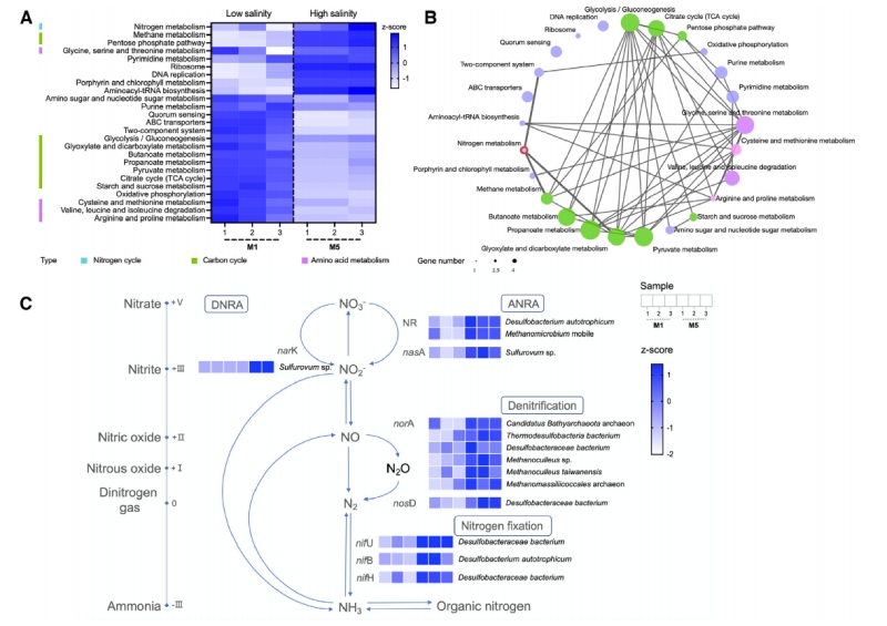- 功能基因通過KEGG途徑富集的結(jié)果表明,氮代謝相關(guān)功能基因在高鹽環(huán)境下的表達(dá)水平高于低鹽環(huán)境,而碳和氨基酸代謝相關(guān)功能基因在低鹽環(huán)境下的表達(dá)水平高于高鹽環(huán)境。這表明SWI通過建立鹽度梯度刺激氮循環(huán);