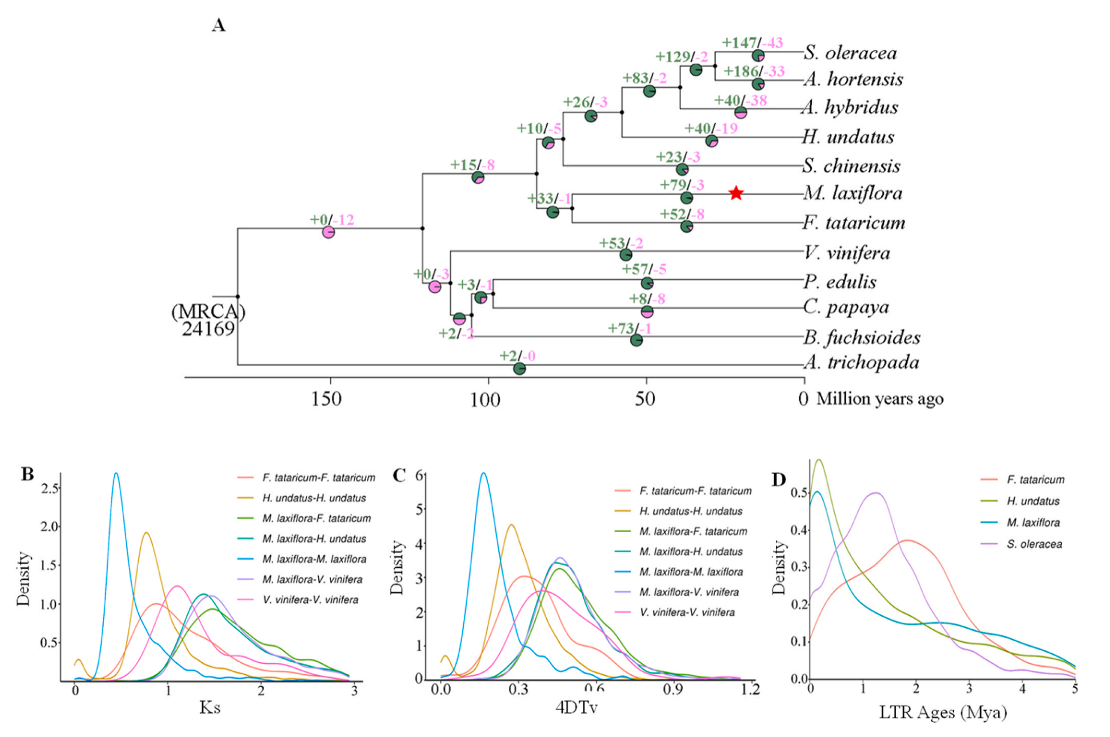 比較基因組研究發(fā)現(xiàn)疏花水柏枝與苦蕎(F. tataricum)的親緣關系最為密切,大約在65-81百萬年前(Mya)發(fā)生分化;在19.74 ~ 24.60 Mya之間發(fā)生了一次全基因組復制(WGD), 4dTV分析證實了這一點。在0.15 Mya左右存在一個長末端重復(LTR)插入。這些基因組變化可能與疏花水柏枝在進化過程中所經(jīng)歷的環(huán)境劇變(如青藏高原隆升)有關。基因家族分析顯示疏花水柏枝的特有基因家族與能量代謝和信號轉導密切相關;85個基因在疏花水柏枝基因組中經(jīng)歷了正選擇,這些基因在與氨基酸合成和代謝相關的KEGG通路中顯著富集。