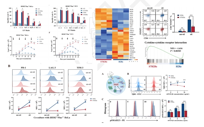 利用T2A元件,作者設(shè)計(jì)了針對(duì)CD8α柄、共刺激結(jié)構(gòu)域(CD28)和CD3ζ細(xì)胞內(nèi)結(jié)構(gòu)域,共翻譯表達(dá)SMAD7片段的CAR-T細(xì)胞(S7H28z,S71928z,S7M28z),長期培養(yǎng)后發(fā)現(xiàn),SMAD7顯著改善了CAR-T細(xì)胞與表達(dá)HER2的HeLa細(xì)胞共培養(yǎng)時(shí)的細(xì)胞毒性,同時(shí)當(dāng)與HER2+HeLa細(xì)胞共培養(yǎng)時(shí),表達(dá)SMAD7的CAR-T細(xì)胞與不含SMAD7?CAR-T細(xì)胞相比增殖更快。為了更好地理解SMAD7如何影響CAR-T細(xì)胞的基因表達(dá)譜,我們將其與HER2+Fluc+ HeLa細(xì)胞共培養(yǎng)后進(jìn)行了轉(zhuǎn)錄組測(cè)序,與傳統(tǒng)的CAR-T細(xì)胞相比,共表達(dá)SMAD7的細(xì)胞系中標(biāo)志T細(xì)胞衰竭的PDCD1、LAG3和TIGIT顯著下調(diào),同時(shí)標(biāo)志T細(xì)胞持續(xù)激活并分化為記憶表型的CD27、Jun和KLF9上調(diào),富集分析結(jié)果表明傳統(tǒng)CAR-T細(xì)胞與共表達(dá)SMAD7的細(xì)胞之間的差異基因主要富集在T細(xì)胞分化、近端T細(xì)胞受體信號(hào)通路和細(xì)胞因子產(chǎn)生等通路,這些結(jié)果表明,共表達(dá)SMAD7的CAR-T細(xì)胞的特點(diǎn)是在抗原暴露后可減輕衰竭和減少細(xì)胞因子的產(chǎn)生。