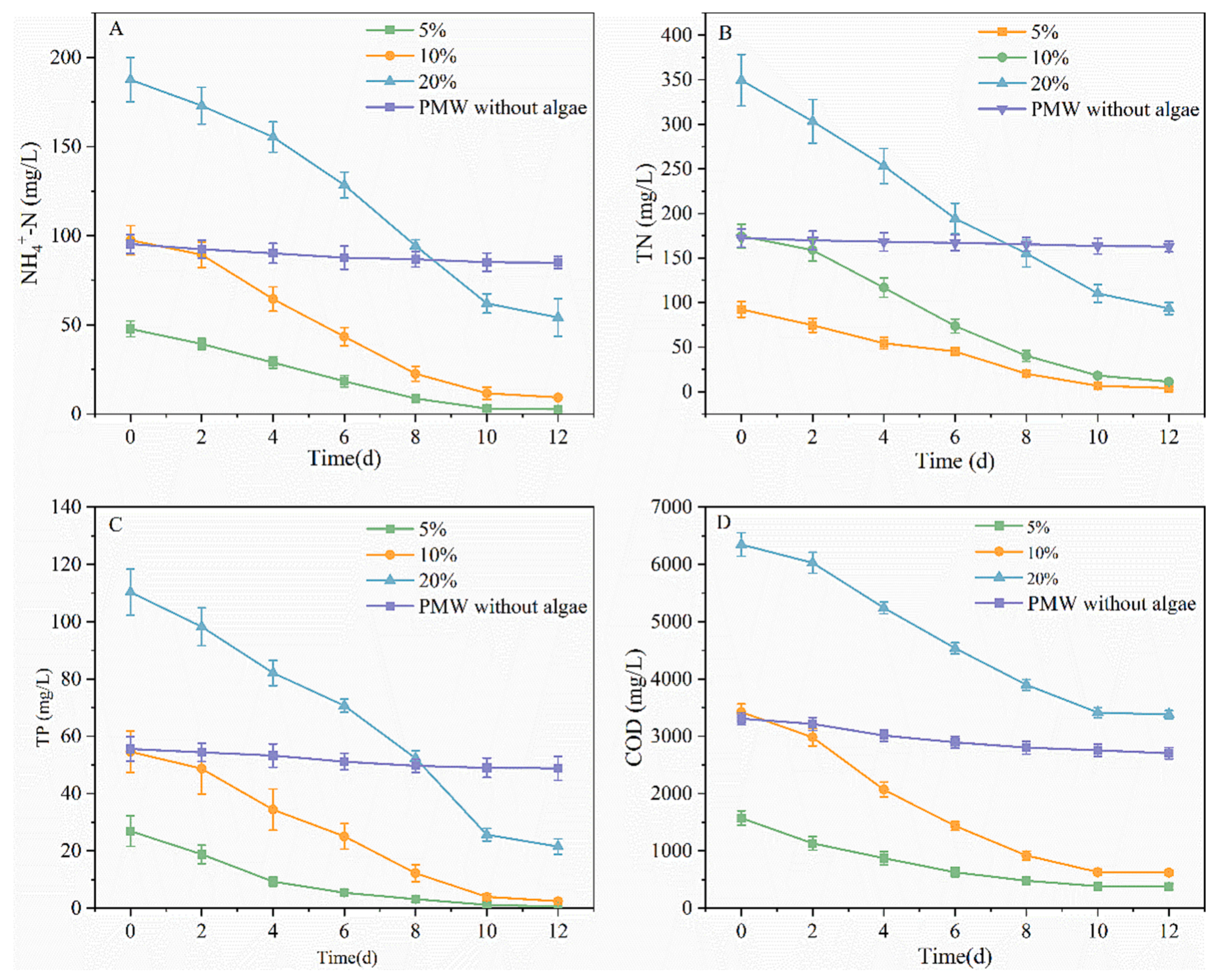 結果顯示,經(jīng)過12天的處理,原生微生物在10%的PMW中分別去除了6%、11%、12%和18%的TN、NH4+-N、總磷和COD(圖1)。這表明,雖然PMW中存在的原生細菌促進了營養(yǎng)物質的去除,但硅藻在處理原料PMW中發(fā)揮了主要作用。根據(jù)上述結果和PMW的排放標準,確定了10%的PMW是通過C. muelleri和細菌培養(yǎng)對PMW進行生物修復的最適宜濃度。