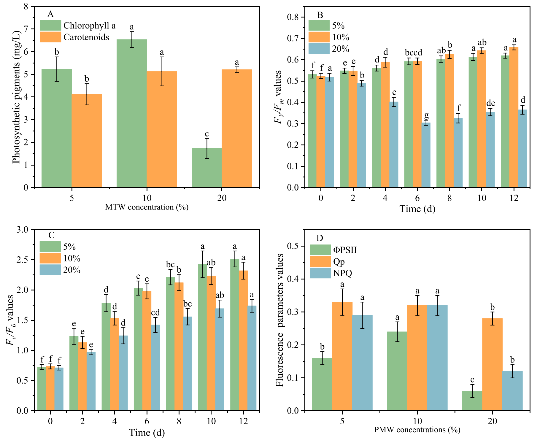 Fv/Fm檢測可以快速評價微藻對生長環(huán)境的適應性。隨著PMW濃度的增加,在圖2B中,在第12天,10% PMW的Fv/Fm最高(0.658)。與未添加PMW相比,5% PMW、10% PMW和20% PMW的Fv/Fm分別降低了8%、2%和46%。這表明藻類的能量轉化率降低,對微藻的光合作用有一定的抑制作用。在20%的PMW中,F(xiàn)v/Fm值恢復,表明C. muelleri對不利環(huán)境產生了特異性抗性。Fv/F0可用于確定植物的光合效率和生理狀態(tài)。Fv/F0的下降(圖2C)表明C. muelleri供體側的水分裂復合物崩潰,導致電子傳遞能力下降。有效量子產率(ΦPSII)可以揭示微藻在不同環(huán)境條件下的生理狀態(tài)和PSII的性能。5%、10%和20% PMW組C. muelleri的ΦPSII分別為0.16、0.24和0.06(圖2D)。總體而言,10% PMW處理下C. muelleri的光合效率最好,這也有利于PMW處理。