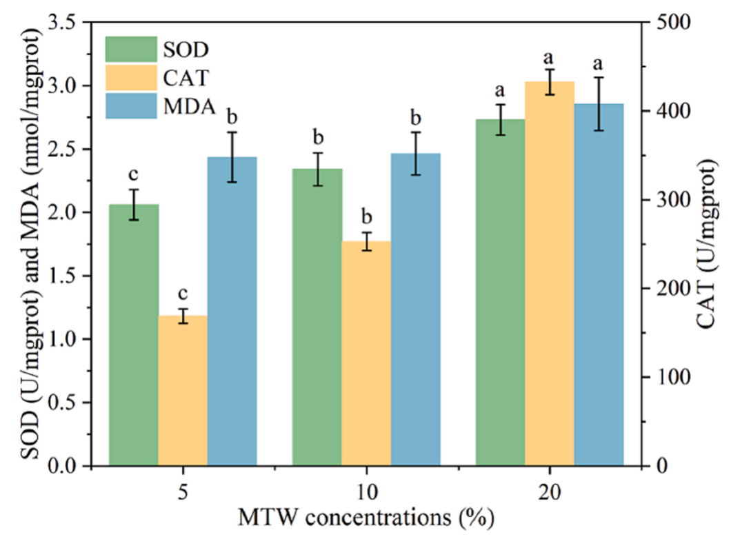 隨著PMW濃度的增加,微藻-細菌聯(lián)合體分泌的ROS和MDA也逐漸增加。這再次證明,與5%和20%的PMW相比,10%的PMW是廢水處理和C. muelleri培養(yǎng)的最佳初始濃度。
