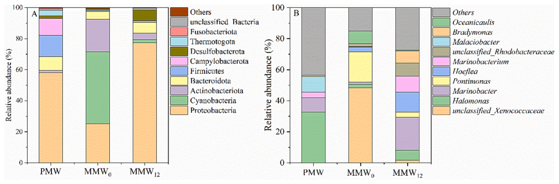 為了進一步明確細菌在系統(tǒng)中的作用,在門和屬水平上的10個優(yōu)勢分類群如圖5A和5B所示。Proteobacteria豐度在PMW中達到58%,與C. muelleri在MMW12共培養(yǎng)條件下增加到77%。變形桿菌中含有多種促進氮轉化和有機物降解的功能菌株。此外,與PMW相比,MMW12組放線菌和藍藻菌的豐度也有所增加。
