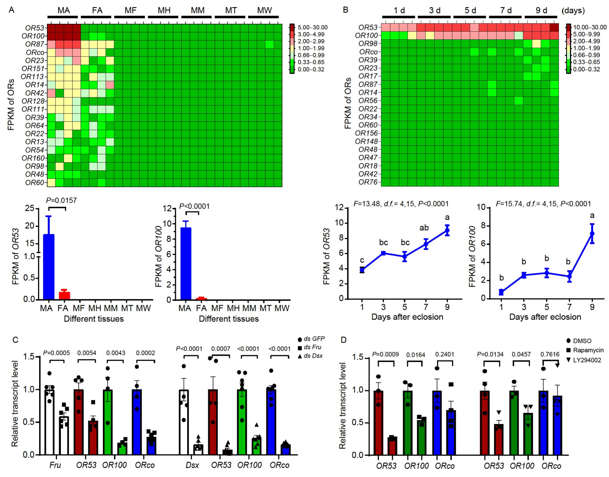 研究人員利用Bulk RNA測序技術(shù)分析了雄蟲不同組織中嗅覺受體基因的表達(dá)情況,并通過果蠅遺傳學(xué)方法,將美洲大蠊的嗅覺受體基因在果蠅中表達(dá),以鑒定PA和PB的受體。通過RNA測序分析得到的嗅覺受體基因在不同組織(雄蟲觸角-MA、雌蟲觸角-FA、雄蟲前足-MF、雄蟲頭部-MH、雄蟲口器-MM、雄蟲精巢-MT和雄蟲翅-MW)和不同日齡中的表達(dá)水平(圖2A、2B),以及通過qPCR驗證的OR53、OR100和ORco基因在雄蟲觸角中敲除fru或dsx基因后的表達(dá)水平(圖2C),以及經(jīng)過營養(yǎng)信號通路抑制劑處理后的表達(dá)水平變化(圖2D)。研究鑒定出OR53和OR100為PA/PB和PA的受體,并發(fā)現(xiàn)它們在雄蟲觸角中的表達(dá)模式與行為測定結(jié)果相吻合,證實了這兩種受體在性信息素感知中的關(guān)鍵作用。