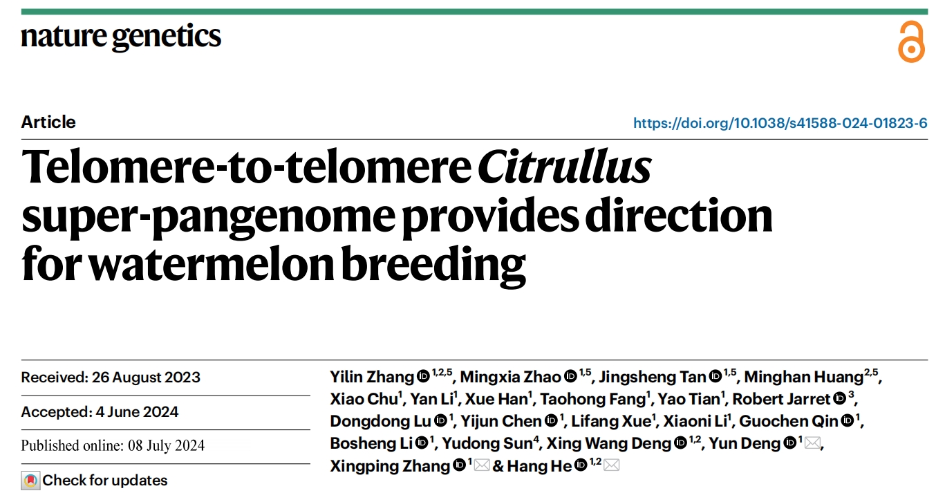 2024年7月8日,北京大學(xué)現(xiàn)代農(nóng)業(yè)研究院在國(guó)際頂尖期刊《自然-遺傳學(xué)》上在線發(fā)表了題為Telomere-to-telomere?Citrullus?Super-pangenome Provides Direction for Watermelon Breeding的研究成果,是西瓜科研領(lǐng)域的重大突破。