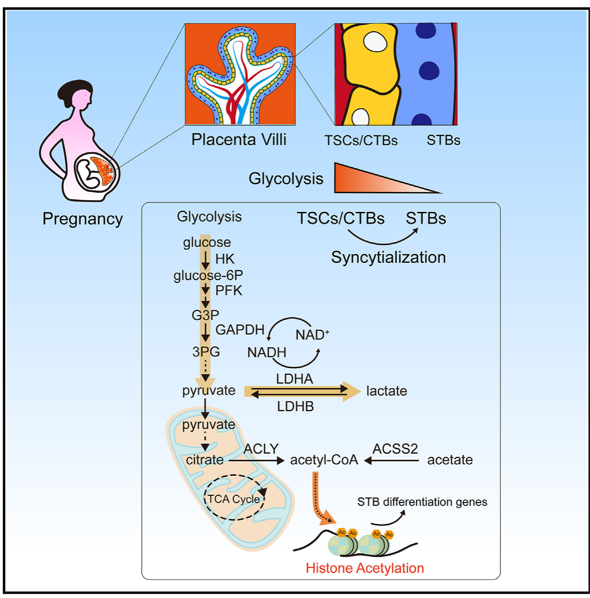 該研究通過(guò)代謝組學(xué)、轉(zhuǎn)錄組學(xué)、蛋白組學(xué)和表觀組學(xué)等技術(shù),使用人類妊娠早期胎盤(pán)樣本和人類滋養(yǎng)層干細(xì)胞(hTSCs)發(fā)現(xiàn),葡萄糖代謝在hTSCs和細(xì)胞滋養(yǎng)層細(xì)胞中高度活躍,但在合胞過(guò)程中,葡萄糖代謝降低到基礎(chǔ)水平,仍然是補(bǔ)充乙酰輔酶A和分化潛力所必需的。補(bǔ)充乙酸可以通過(guò)補(bǔ)充乙酰輔酶A和維持組蛋白乙酰化來(lái)挽救糖酵解缺乏的合胞滋養(yǎng)細(xì)胞融合,從而挽救合胞基因的激活。即使是短暫的糖酵解缺乏也會(huì)永久性地抑制分化潛能和促進(jìn)炎癥,在體內(nèi)也可以通過(guò)短暫補(bǔ)充乙酸永久地挽救。這些結(jié)果表明,hTSCs在合胞過(guò)程中僅保留基礎(chǔ)糖酵解乙酰輔酶A代謝,通過(guò)營(yíng)養(yǎng)反應(yīng)性組蛋白乙?;{(diào)節(jié)細(xì)胞命運(yùn),這對(duì)我們理解胎盤(pán)和胎兒營(yíng)養(yǎng)之間的平衡具有重要意義。