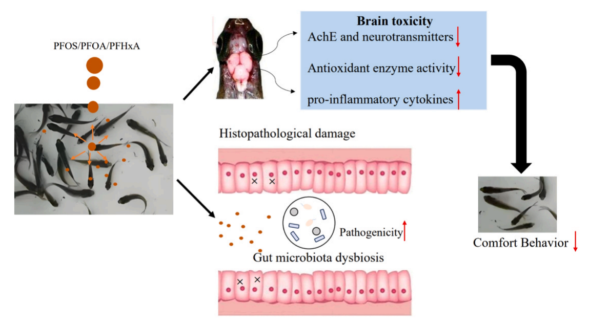 水污染和PFAS殘留已成為全球性的環(huán)境問題。暴露于PFAS已被證明會引起毒性作用。然而,在大多數(shù)研究中,PFAS暴露濃度很高,導(dǎo)致研究結(jié)果低估了實(shí)際環(huán)境濃度下的毒性作用。魚是脊椎動(dòng)物中最大、種類最多的一類。魚類作為胚胎學(xué)、神經(jīng)生物學(xué)和環(huán)境生物學(xué)研究的實(shí)驗(yàn)?zāi)P驮絹碓接杏?。鯽魚(Carassius auratus)因其口感鮮美、營養(yǎng)價(jià)值高而成為人們喜愛的淡水魚,由于適應(yīng)性強(qiáng),鯽魚養(yǎng)殖地區(qū)多,分布廣泛,2020年占淡水養(yǎng)殖魚類總產(chǎn)量的8.90%。因此,研究鯽魚對不同污染物的應(yīng)激反應(yīng)具有重要意義。該研究主要研究了PFAS對鯽魚神經(jīng)系統(tǒng)和腸道菌群的毒性,腦和腸道組織病理學(xué)變化表明,PFAS加重了對鯉魚腦和腸道組織病理學(xué)的影響。
