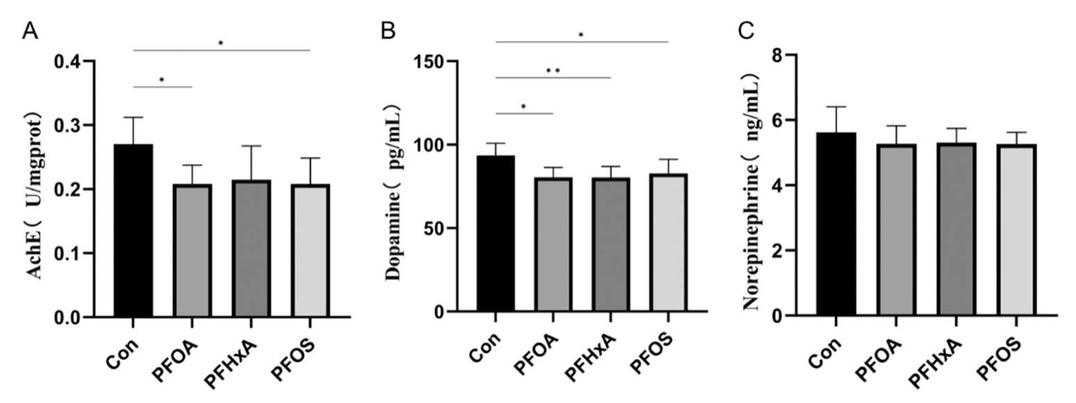 研究了PFAS對鯽魚腦組織乙酰膽堿酯酶和神經(jīng)遞質(zhì)活性的影響。與Con組相比,PFOA和PFOS組腦內(nèi)乙酰膽堿酯酶活性顯著降低。此外,PFOA、PFHxA和PFOS組多巴胺(DA)水平顯著降低(圖2B)。然而,去甲腎上腺素(NE)水平在實(shí)驗(yàn)魚組之間沒有顯著變化(圖2C)。這些結(jié)果表明,PFAS暴露抑制了魚腦中的AChE和神經(jīng)遞質(zhì)水平,并影響了整體腦功能。