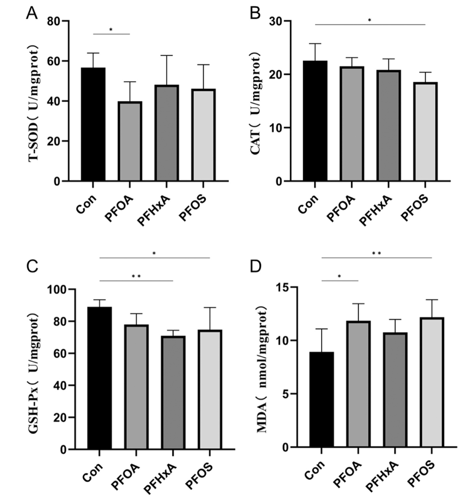 處理?xiàng)l件:對照組(Con)、全氟辛烷磺酸(PFOS)、全氟辛酸(PFOA)、十一氟己酸(PFHxA)組指標(biāo)檢測:過氧化氫酶(CAT)、總超氧化物歧化酶(T-SOD)、谷胱甘肽過氧化物酶(GSH-Px)、丙二醛(MDA)、乙酰膽堿酯酶(AChE)