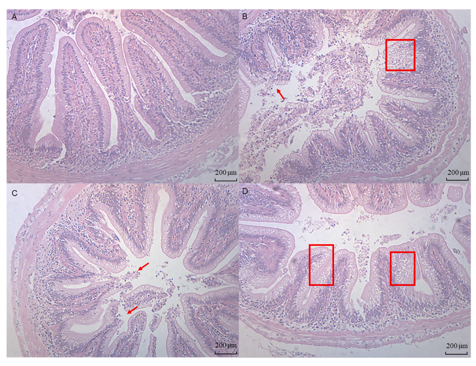 組織病理學(xué)染色分析各暴露組腦、腸基本變化。Con組腦組織組織結(jié)構(gòu)正常,包括正常的浦肯野細(xì)胞層和分子層(圖3A)。pfas治療組神經(jīng)周圍明顯空泡化。此外,PFHxA和PFOS組可見廣泛的多灶性脫鞘(圖3B和C)。在PFOA組,充血血管壁透明化,靠近收縮的神經(jīng)元,神經(jīng)周圍形成空泡(圖3D)。Con組鯽魚腸黏膜形態(tài)結(jié)構(gòu)完整,腸黏膜上皮細(xì)胞細(xì)胞核排列緊密整齊,無損傷跡象(圖4A)。在每個(gè)pfas處理組中,絨毛膜絨毛的長度顯著減少,并與一定程度的損傷有關(guān)。PFHxA和PFOS組觀察到上皮粘膜破裂(圖4B和C), PFHxA和PFOA組腸絨毛萎縮、空泡化、細(xì)胞核紊亂(圖4B和D)。H&E染色結(jié)果表明,PFAS暴露對鯽魚腸道和腦組織造成損傷。