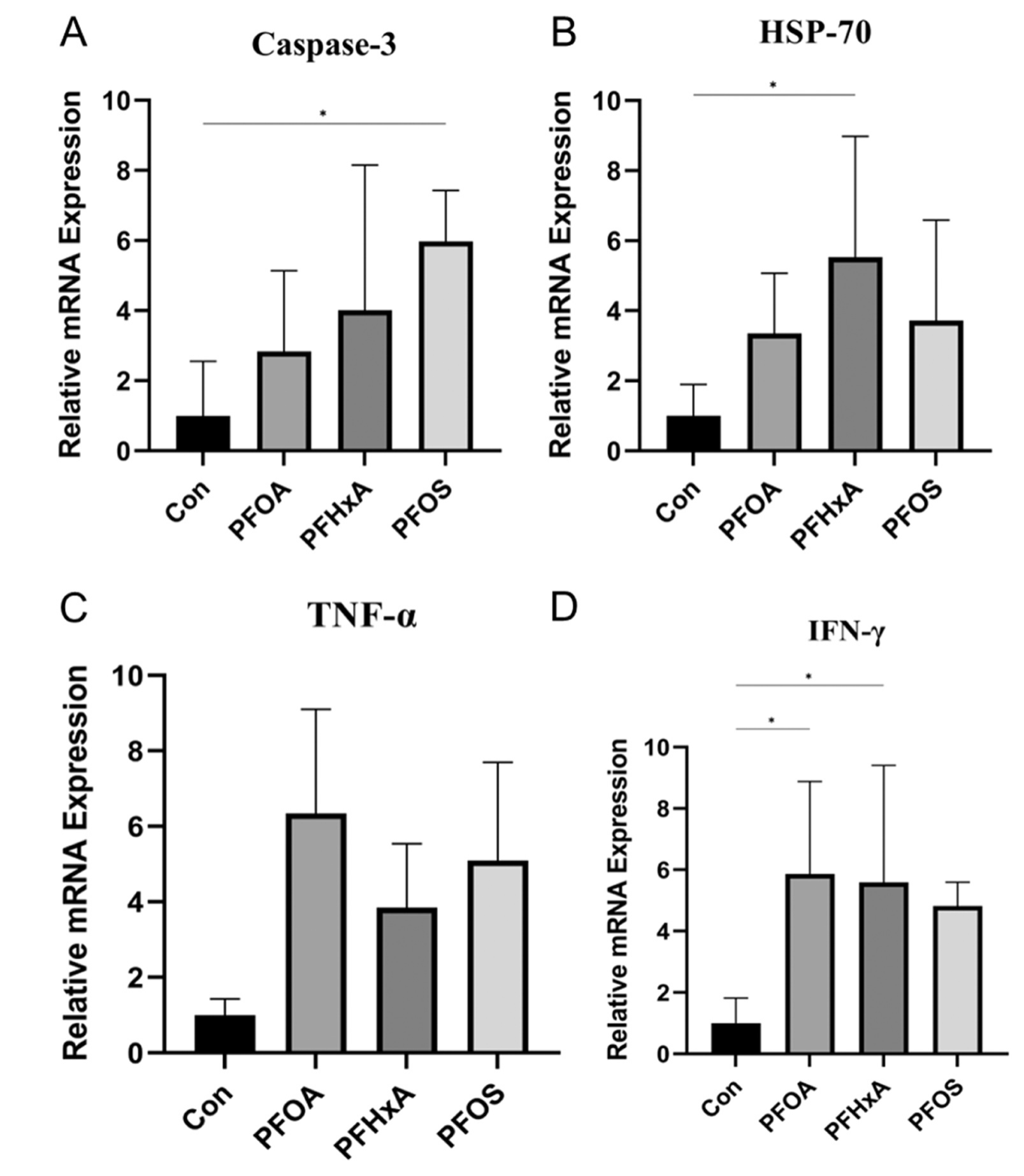 PFOS組與Con組相比,應(yīng)激相關(guān)基因caspase-3的表達(dá)顯著升高(圖5A)。同樣,在PFHxA組中,HSP-70的表達(dá)顯著增加(圖5B)。此外,促炎細(xì)胞因子INF-γ在PFOA和PFHxA組中的表達(dá)水平顯著升高(圖5D),而TNF-α的表達(dá)在兩組間無顯著差異(圖5C)。