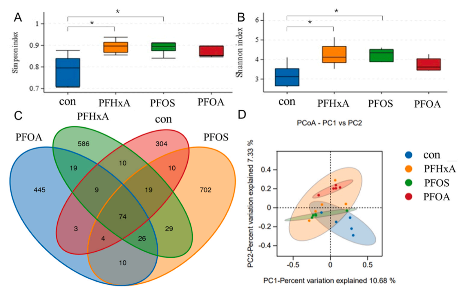 與Con組相比,PFHxA和PFOS組細(xì)菌群落的Simpson和Shannon指數(shù)明顯高于Con組(圖6A和B),表明細(xì)菌物種多樣性有所增加?;贠TU的venn圖分析(圖6C),四組之間重疊OTUs數(shù)量相對較少(不超過100個(gè)),各組特有的OTUs相對較多(均超過300個(gè))。圖6D清楚地顯示了Con組與其他三組在微生物群方面的顯著差異,表明PFAS暴露引起了鯽魚腸道微生物群組成的變化。