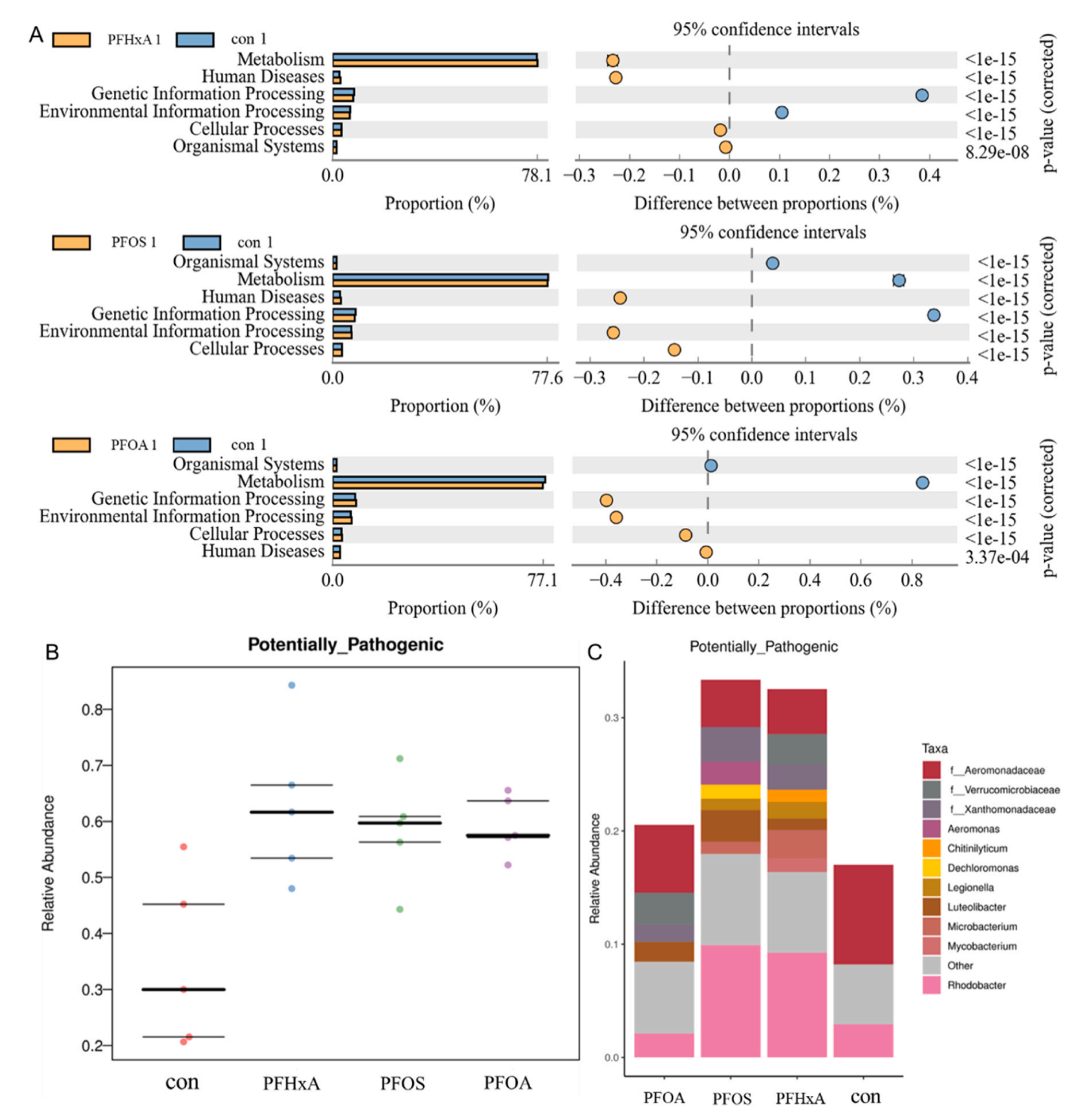 根據(jù)PICRUSt2,根據(jù)特征序列預(yù)測整個(gè)群落的通路變化,并進(jìn)行功能基因差異分析。與Con組相比,所有三個(gè)PFAS治療組都顯著改善了人類疾病中涉及的細(xì)胞過程和信號通路(圖8A)。利用BugBase對表型分類進(jìn)行預(yù)測。與Con組相比,每個(gè)PFAS治療組顯著增加了微生物群的潛在致病性(圖8B)。在屬水平上,與Con組相比,各PFAS處理組增加了Luteolibacter的相對豐度,PFOS和PFHxA組增加了Rhodobacter和Legionella的相對豐度,PFOS組增加了decchloromonas和Aeromonas的相對豐度(圖8C)。這些結(jié)果表明,PFAS可能導(dǎo)致鯽魚腸道菌群的潛在致病性增加。