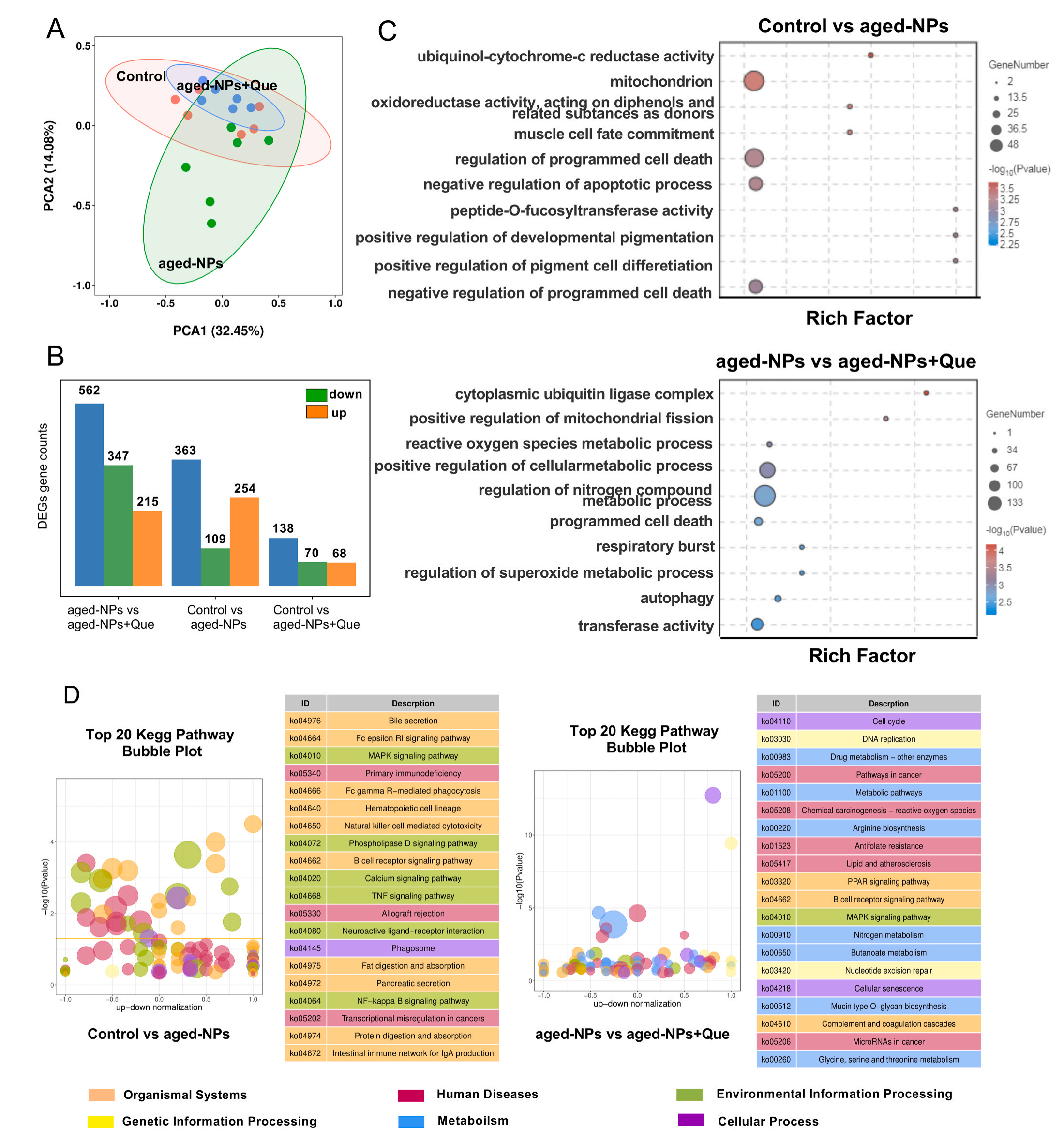 細胞成分中最突出的基因Term是線粒體,鑒定出45個DEGs,值得注意的是,老化的NPs影響了與氧化還原酶活性和泛醌細胞色素-c還原酶活性相關(guān)的活性,這些發(fā)現(xiàn)表明,老化的NPs會導(dǎo)致氧化應(yīng)激、線粒體損傷和細胞凋亡,線粒體損傷激活線粒體凋亡通路,該通路在凋亡中起著重要作用,表明老化的NPs激活線粒體凋亡通路,最終導(dǎo)致細胞凋亡。而增加Que后,差異基因顯著細胞代謝和細胞分解中,如氮化合物代謝、轉(zhuǎn)移酶活性、正調(diào)控DNA修復(fù)等,KEGG富集結(jié)果顯示,老化NPs組差異基因參與信號轉(zhuǎn)導(dǎo)、免疫系統(tǒng)、癌癥、轉(zhuǎn)運和轉(zhuǎn)分解代謝等通路,Que治療后癌癥的細胞代謝途徑和途徑顯著富集,此外,Que干預(yù)改變了自由基代謝,如化學(xué)致癌-活性氧和GSH代謝,qPCR結(jié)果驗證了相關(guān)基因表達。