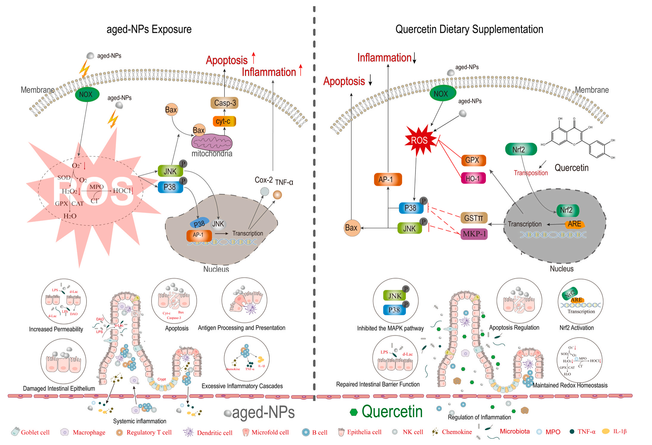 槲皮素 (Que) 占膳食總黃酮類化合物的 60-75%,是一種天然化合物,存在于人類飲食中的各種食物中,包括蔬菜、水果和茶,Que 及其衍生物可以調(diào)節(jié)多個細胞內(nèi)靶標(biāo)和細胞信號傳導(dǎo)過程的能力,具有抗氧化和抗炎分子的作用,探索膳食補充劑 Que 是否可以改善 NPs 誘導(dǎo)的腸道屏障功能障礙具有重要意義。本研究通過轉(zhuǎn)錄組學(xué)、組織病理學(xué)和免疫學(xué)分析探討老化 NPs 暴露下腸道屏障損傷的機制,此外,還評估了 Que 在老化 NPs 暴露下對腸道屏障的積極影響。