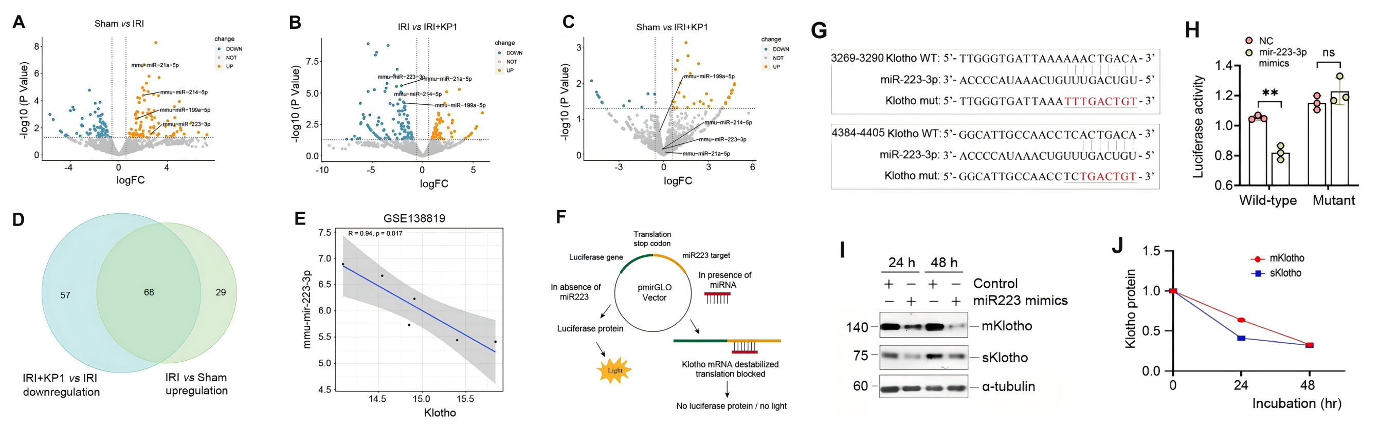 由于 KP1 不影響 Klotho mRNA 水平和蛋白質(zhì)穩(wěn)定性,作者開始探索 KP1 是否通過miRNA調(diào)節(jié) Klotho 蛋白,在 UIRI 腎臟中鑒定到了68個上調(diào)miRNA,在注射 KP1 后恢復到基線,其中 10 個與 Klotho mRNA 的 3′-UTR 特異性結(jié)合,其中miR-223-3p表現(xiàn)非常明顯,且在對公共轉(zhuǎn)錄組數(shù)據(jù)集分析后發(fā)現(xiàn),miR-223-3p 與 Klotho 水平呈負相關(guān),支持了 miR-223-3p 與 Klotho 調(diào)節(jié)的相關(guān)性。