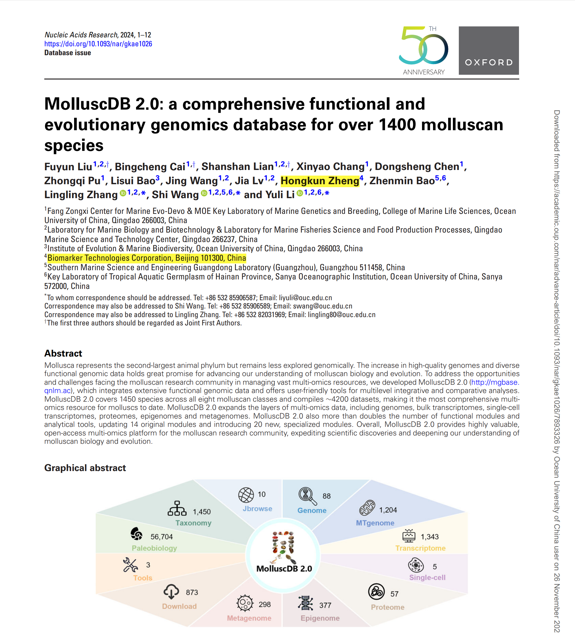 中國海洋大學(xué)“海洋生物遺傳學(xué)與育種”教育部重點實驗室、方宗熙海洋生物進(jìn)化與發(fā)育中心包振民院士和王師教授團(tuán)隊在國際生物信息數(shù)據(jù)庫領(lǐng)域頂刊Nucleic Acids Research在線發(fā)表了軟體動物功能和進(jìn)化基因組學(xué)綜合數(shù)據(jù)庫“MolluscDB 2.0: a comprehensive functional and evolutionary genomics database for over 1400 molluscan species”(MolluscDB 2.0:面向超過1400個軟體動物種類的功能和進(jìn)化基因組學(xué)綜合數(shù)據(jù)庫)。