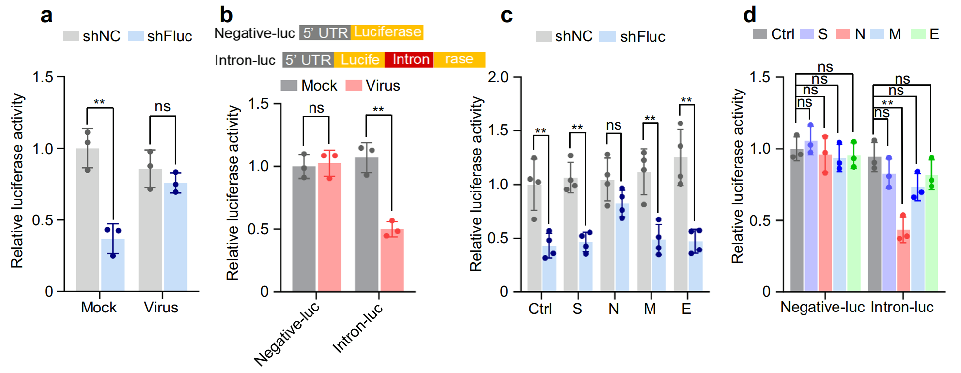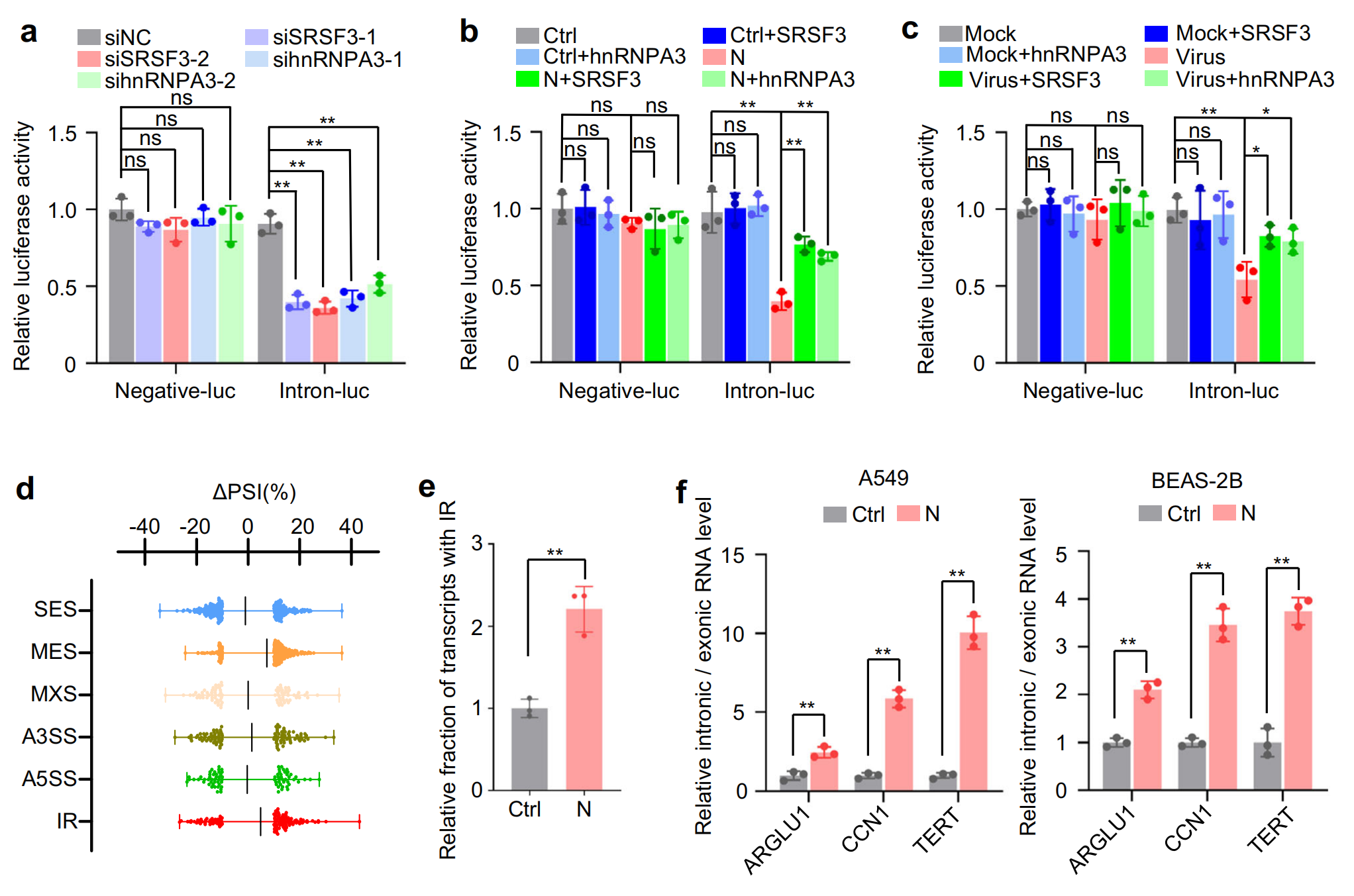 SRSF3或hnRNPA3敲除抑制了含有內(nèi)含子的報告基因小基因的剪接,證實了它們確實是剪接因子,而它們的過表達部分緩解了 N 蛋白或 SARS-CoV-2 感染對 RNA 剪接的抑制作用,進一步進行全長轉錄組測序,通過可變剪接分析發(fā)現(xiàn),N 蛋白誘導內(nèi)含子保留。此外,RT-qPCR證實,異位 N 蛋白表達或 SARS-CoV-2 感染降低了一組內(nèi)源性內(nèi)含子的剪接效率,SRSF3?和?hnRNPA3?過表達部分減輕了 N 蛋白和 SARS-CoV-2 對 RNA 剪接的抑制作用,這些結果表明,N 蛋白通過降低?SRSF3?和?hnRNPA3?的表達來抑制 RNA 剪接。