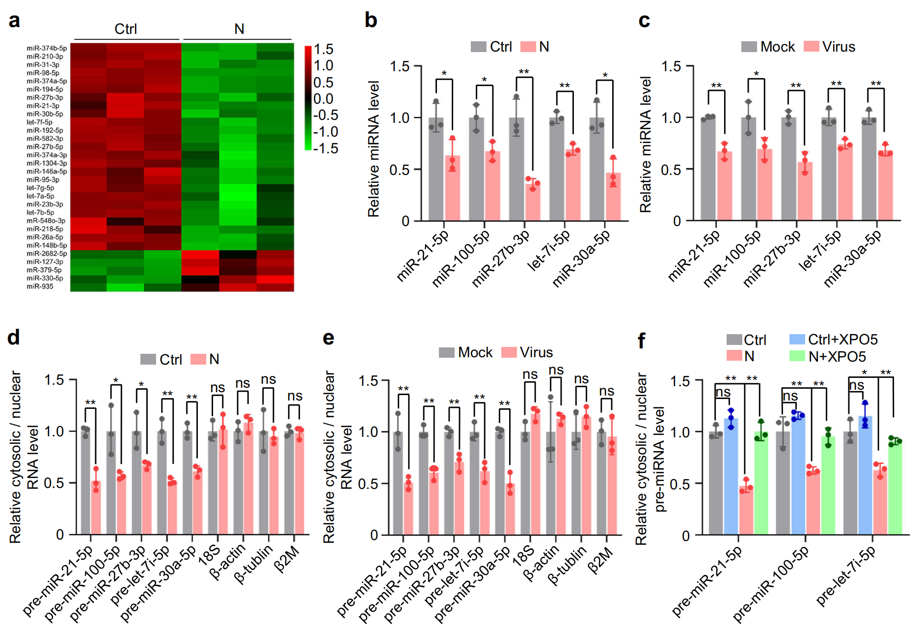 XPO5和Dicer在 miRNA 生物合成中起關鍵作用,小 RNA 深度測序顯示,N 蛋白誘導 miRNA 表達的整體下調,對 A549 和 BEAS-2B 細胞中表達量最高的前五個 miRNA進行定量驗證顯示,它們在表達 N 蛋白的細胞和 SARS-CoV-2 感染的細胞中均下調;生化分級分離實驗顯示,異位 N 蛋白表達或 SARS-CoV-2 感染誘導 pre-miRNA 的核保留,如細胞核中 pre-miRNA 水平的增加和細胞質中 pre-miRNA 水平的降低所示,?XPO5過表達后得到緩解。此外,異位 N 蛋白表達或 SARS-CoV-2 感染降低了成熟 miRNA 和 pre-miRNA 之間的比率,Dicer過表達后得到緩解。總體而言,這些發(fā)現(xiàn)表明,N 蛋白通過降低?XPO5?表達阻斷 pre-miRNA 從細胞核到細胞質的運輸,并通過下調?Dicer?表達抑制 pre-miRNA 向成熟 miRNA 的加工。