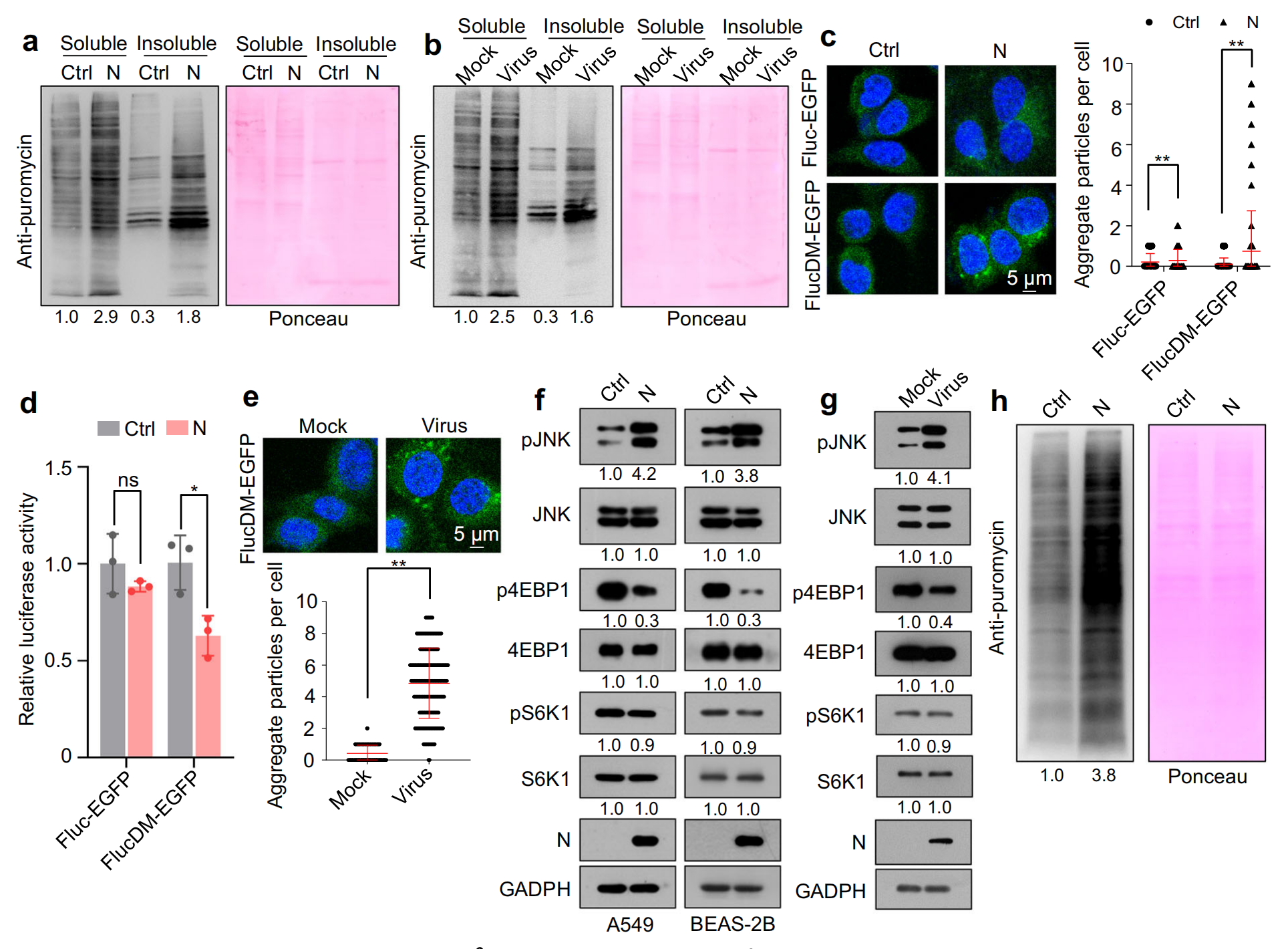剪接抑制會誘導廣泛的 IR 和隨后的內(nèi)含子保留 mRNA 的翻譯,一部分內(nèi)含子衍生的多肽容易縮合且具有蛋白毒性,用嘌呤霉素對新生多肽進行代謝標記,結果顯示異位 N 蛋白表達或 SARS-CoV-2 感染誘導不溶性蛋白合成增加,而N蛋白與RNA的結合主要在可溶性蛋白部分被檢測到,免疫熒光檢測結果表明,N 蛋白和 SARS-CoV-2 感染誘導了 EGFP 聚集體的產(chǎn)生,誘導蛋白毒性應激。