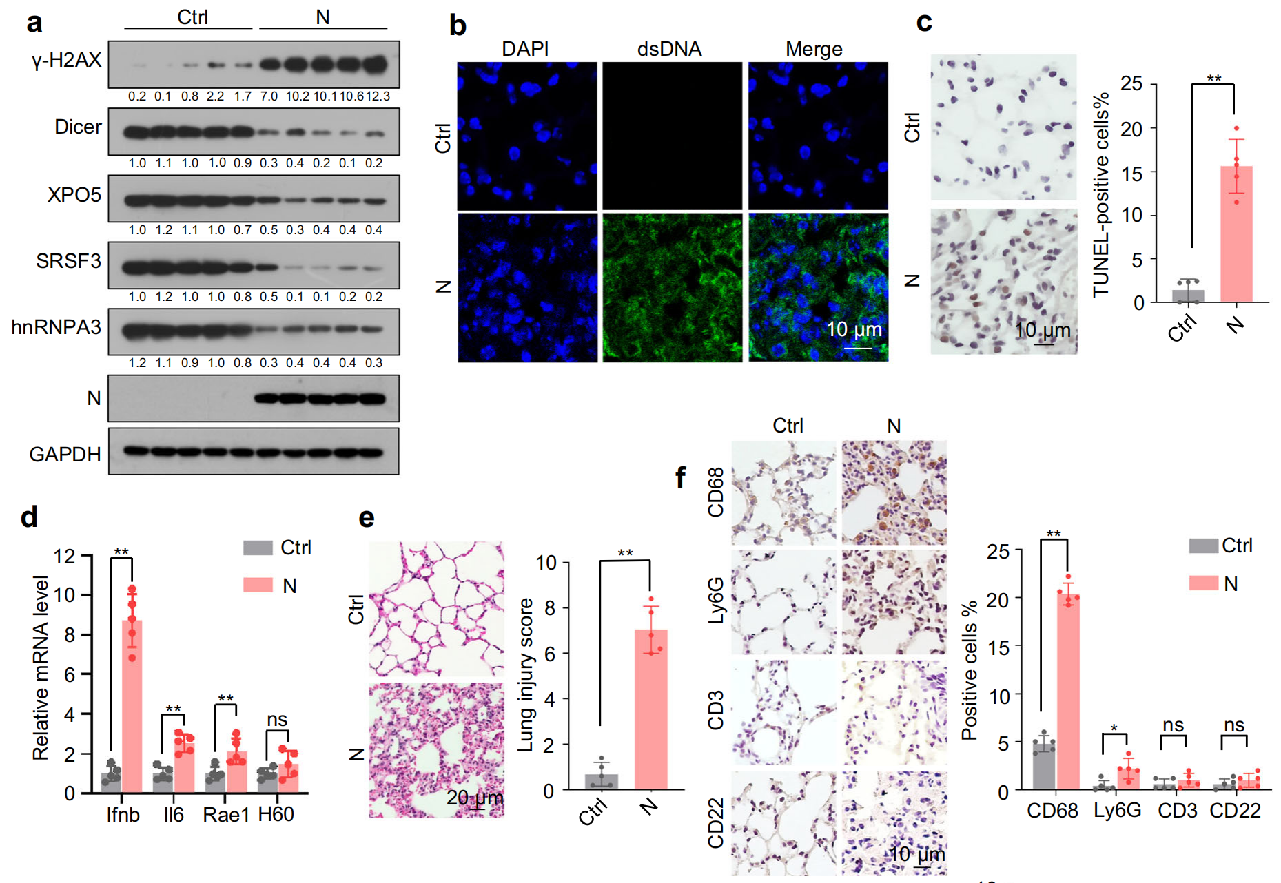 小鼠體內(nèi)驗證結果顯示, N 蛋白在小鼠肺組織中的表達導致?Dicer、XPO5、SRSF3?和?hnRNPA3?下調、DNA 損傷、胞質 DNA 積累、細胞凋亡、IFNβ、IL-6 和 NKG2D 配體上調,以及伴有明顯巨噬細胞浸潤的肺炎,肺組織中?Dicer、XPO5、SRSF3?和?hnRNPA3?敲低導致肺損傷和肺炎,而它們的過表達部分緩解了 N 蛋白誘導的肺炎,這些結果表明,N 蛋白誘導的?Dicer、XPO5、SRSF3?和?hnRNPA3?蛋白表達下調是 SARS-CoV-2 誘導肺炎的一種機制。
