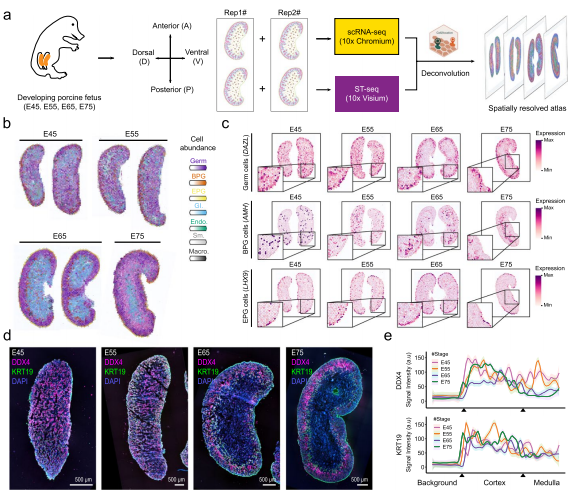 ① 該研究結(jié)合單細(xì)胞RNA測(cè)序(scRNA-seq)和空間轉(zhuǎn)錄組學(xué)(ST)來理解時(shí)空基因表達(dá)譜,并探索在豬卵子發(fā)生早期卵巢微環(huán)境的空間組織。將卵子發(fā)生不同階段的生殖細(xì)胞簇投射到空間圖譜中,揭示了發(fā)育中的豬卵巢中生殖細(xì)胞的“皮質(zhì)-髓質(zhì)(C-M)”分布。豬和人之間的跨物種分析揭示了在卵子發(fā)生過程中生殖細(xì)胞的保守的C-M分布模式,突出了豬可以作為人類早期卵子發(fā)生過程的理想模型。