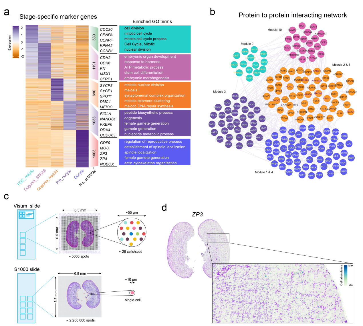 為了進(jìn)一步驗(yàn)證分析,研究人員還在同一E65卵巢組織上使用了更高分辨率(BMKMANU S1000;Spot點(diǎn)大小約為10微米)的平臺進(jìn)行了ST測序。結(jié)果與E65時(shí)的Visium ST解卷積一致,使用S1000平臺在E65時(shí)可視化ZP3陽性卵母細(xì)胞的空間位置也證實(shí)了其在內(nèi)皮層的表達(dá)。