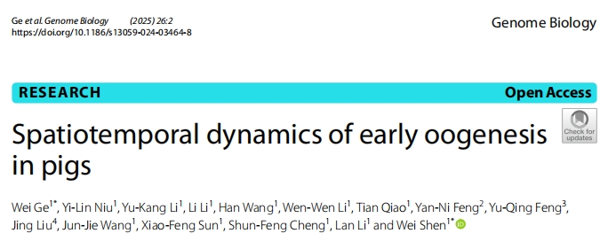 2025年1月,青島農(nóng)業(yè)大學(xué)葛偉教授與沈偉教授團(tuán)隊(duì)在學(xué)術(shù)期刊《Genome Biology》上發(fā)表了一篇題為《Spatiotemporal dynamics of early oogenesis in pigs》的研究論文。該研究利用了單細(xì)胞RNA測序和空間轉(zhuǎn)錄組技術(shù),解析了豬早期卵子發(fā)生中的基因表達(dá)及空間組織特征。研究發(fā)現(xiàn),豬生殖細(xì)胞在卵巢中呈“皮質(zhì)到髓質(zhì)”分布,且與人類卵子發(fā)生過程相似,表明豬是研究人類卵子發(fā)生的良好模型。RNA速度分析揭示了顆粒細(xì)胞譜系特征,空間共定位分析和細(xì)胞通訊分析顯示皮質(zhì)與髓質(zhì)區(qū)域生殖細(xì)胞與體細(xì)胞通訊模式不同,特別是NOTCH信號通路和ECM蛋白在調(diào)控中起關(guān)鍵作用,強(qiáng)調(diào)了卵巢微環(huán)境對生殖細(xì)胞命運(yùn)的重要性。