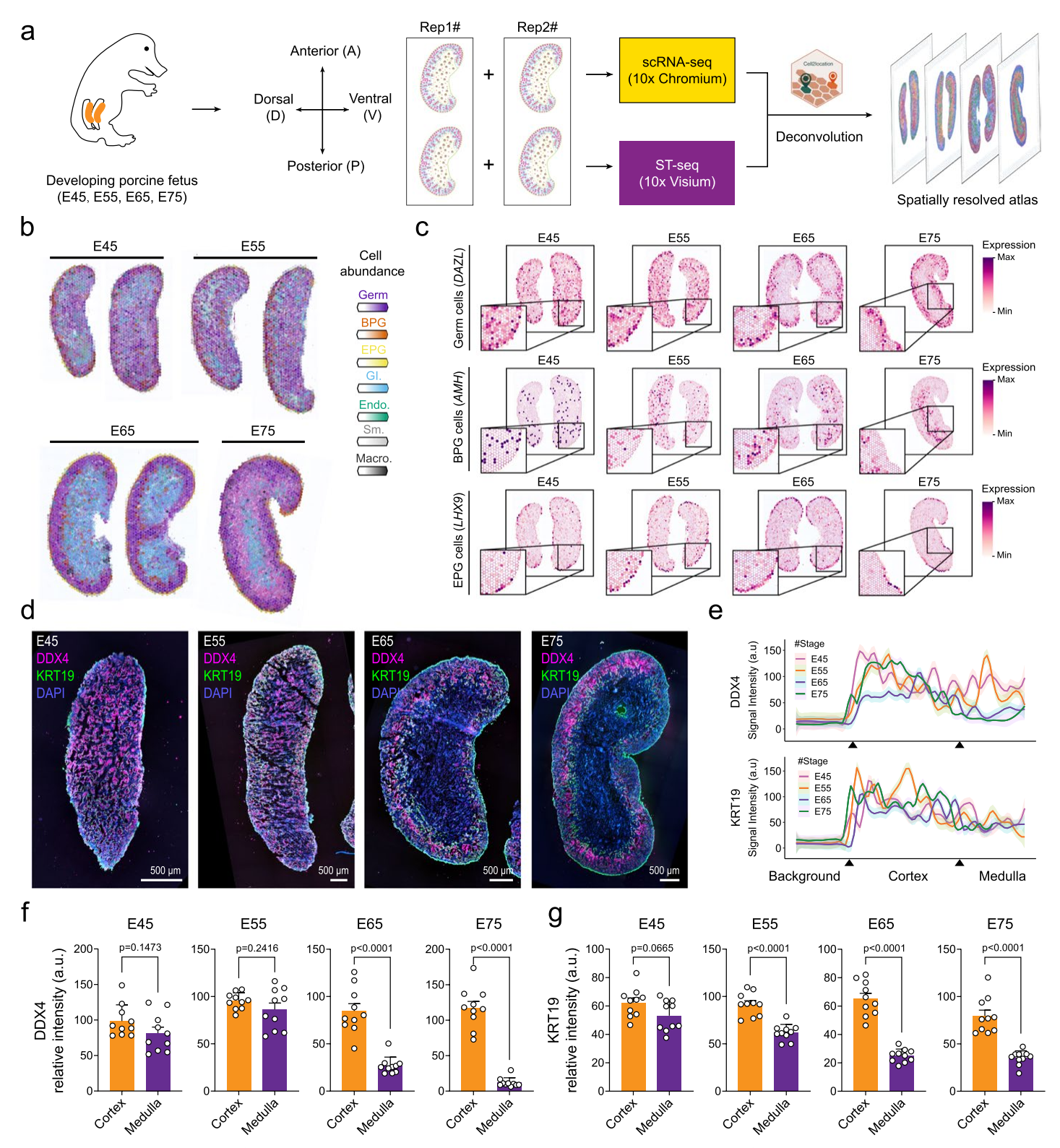 為進(jìn)一步驗(yàn)證分析結(jié)果,研究者進(jìn)行了全組織染色實(shí)驗(yàn),使用生殖細(xì)胞標(biāo)志物DDX4和前顆粒細(xì)胞標(biāo)志物KRT19對E45至E75的胎兒卵巢進(jìn)行染色,實(shí)驗(yàn)結(jié)果與ST數(shù)據(jù)分析結(jié)果一致。此外,研究者還分析了這些陽性細(xì)胞在卵巢背腹軸上的空間分布,并通過熒光強(qiáng)度分析確認(rèn)了生殖細(xì)胞和前顆粒細(xì)胞在皮層和髓質(zhì)區(qū)域的不同分布模式。這些發(fā)現(xiàn)為深入理解豬卵巢發(fā)育過程中細(xì)胞類型的空間動態(tài)變化提供了重要線索。