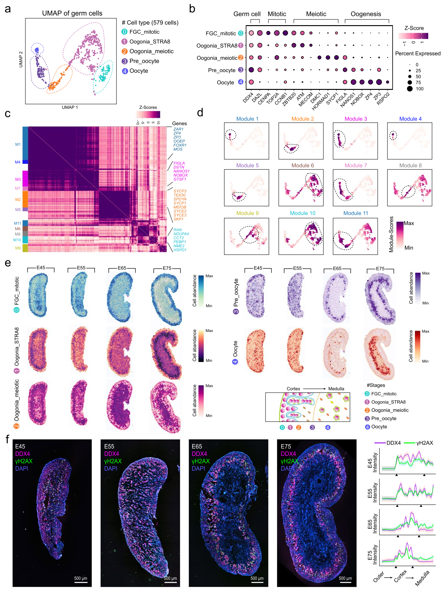 為了深入了解早期豬卵母細(xì)胞生成過程中模塊基因的功能富集情況,研究人員采用Hotspot算法,利用生殖細(xì)胞的scRNA-seq數(shù)據(jù)識別了相關(guān)基因模塊,共鑒定出11個功能各異的基因模塊。通過將單個模塊投影到UMAP圖中,確定了具有簇特異性的信息性基因模塊。剖析了早期豬卵母細(xì)胞生成過程中的基因表達(dá)譜后,研究人員進(jìn)一步在空間環(huán)境中研究了這一過程。通過對ST芯片上的生殖細(xì)胞進(jìn)行解卷積,揭示了早期卵母細(xì)胞生成的皮質(zhì)-髓質(zhì)梯度。為了驗(yàn)證上述分析,研究人員使用生殖細(xì)胞標(biāo)記DDX4和減數(shù)分裂生殖細(xì)胞細(xì)線期標(biāo)記γH2AX進(jìn)行了全組織染色實(shí)驗(yàn),以定位在不同階段啟動減數(shù)程序的生殖細(xì)胞。評估了C-M軸的熒光強(qiáng)度后發(fā)現(xiàn)在E45和E55卵巢中,γH2AX信號沿C-M軸的水平相似,而在E65至E75卵巢中,γH2AX信號在內(nèi)皮層達(dá)到峰值,在髓質(zhì)區(qū)域則減少。