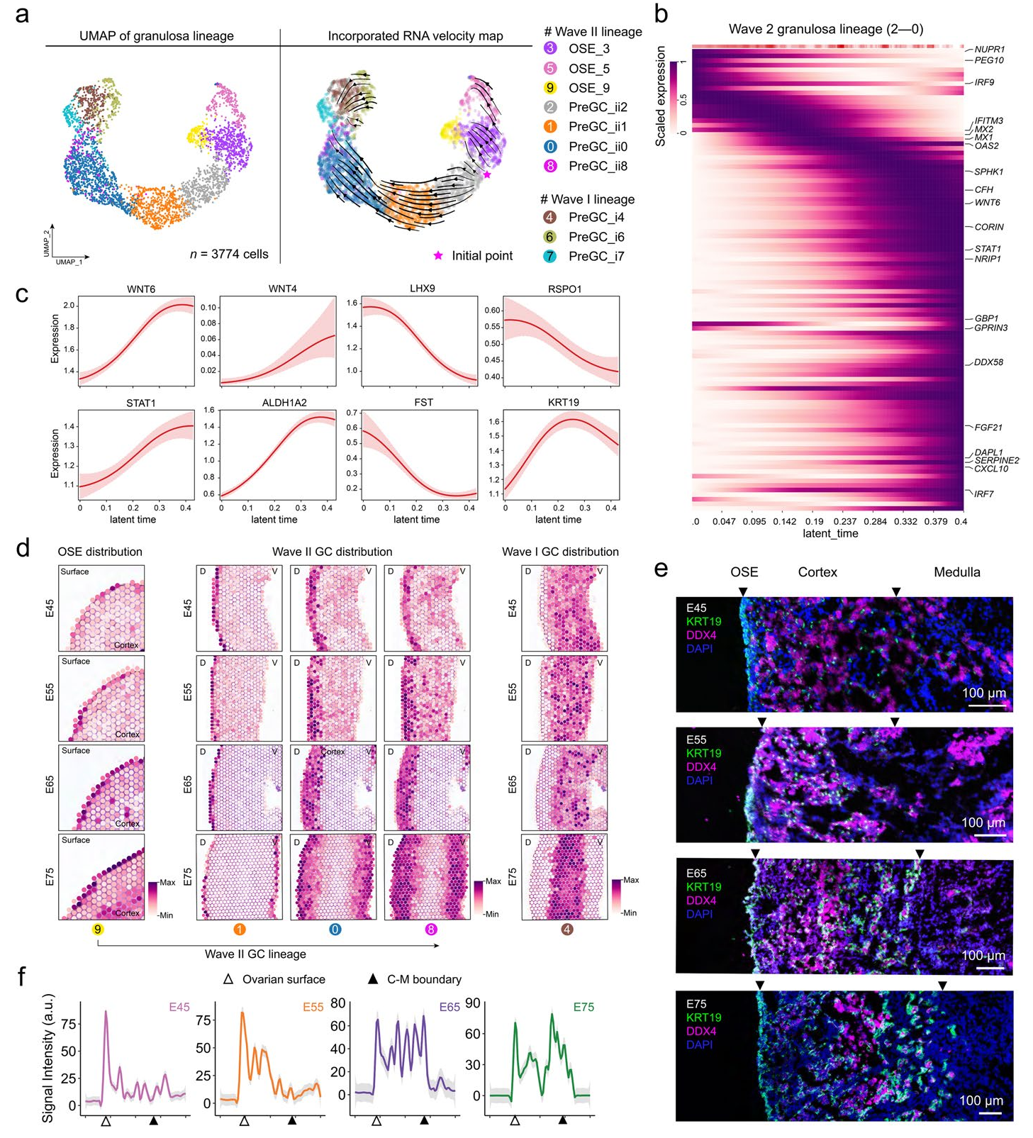 將GI和Sm的標(biāo)記基因整合到空間轉(zhuǎn)錄組學(xué)中,觀察到這些體細(xì)胞的空間位置隨著從E45到E75的發(fā)育進(jìn)展而發(fā)生變化。通過RNA速度分析確定的分化譜系細(xì)胞和增殖狀態(tài)細(xì)胞在E45和E55時(shí)的卵巢中隨機(jī)分布,而在E65時(shí),觀察到這些細(xì)胞在卵巢皮質(zhì)中呈現(xiàn)出明顯的空間聚集模式,特別是在生殖細(xì)胞附近。這些發(fā)現(xiàn)共同揭示了豬卵巢發(fā)育早期體細(xì)胞空間位置模式的動態(tài)變化,表明它們在形成對早期卵子發(fā)生至關(guān)重要的卵巢微環(huán)境中發(fā)揮潛在作用。