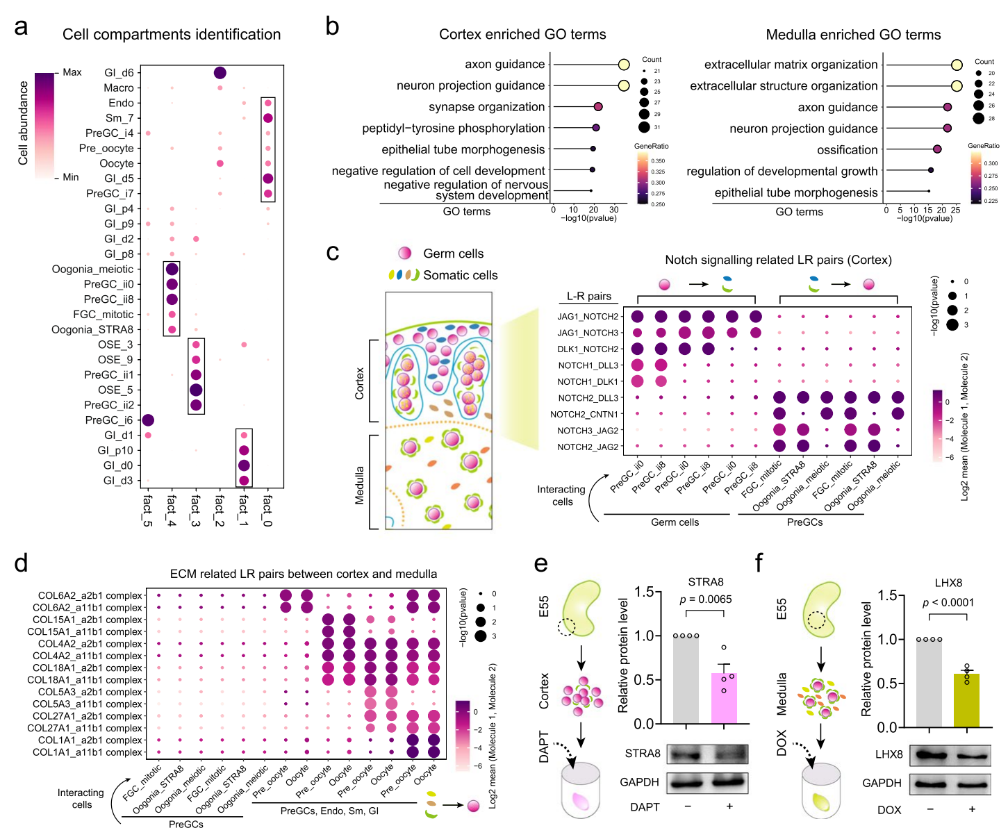 為了進(jìn)一步驗(yàn)證細(xì)胞通訊分析,研究人員接下來探討了在使用從E55卵巢皮質(zhì)和髓質(zhì)中分離的卵巢組織進(jìn)行體外條件下,補(bǔ)充NOTCH信號抑制劑DAPT和基質(zhì)金屬蛋白酶抑制劑多西環(huán)素是否會影響生殖細(xì)胞命運(yùn)。從E55胎兒卵巢中解剖出皮質(zhì)和髓質(zhì)組織,將這些組織進(jìn)行體外培養(yǎng),并在用DAPT處理10天后觀察到皮質(zhì)卵巢組織中減數(shù)分裂標(biāo)志物STRA8的表達(dá)水平顯著降低,而髓質(zhì)卵巢組織則沒有這種情況。相反,在用基質(zhì)金屬蛋白酶抑制劑多西環(huán)素處理10天后,觀察到卵泡形成標(biāo)志物L(fēng)HX8的表達(dá)水平降低,而在皮質(zhì)組織中未觀察到可比的影響。綜上所述,這些數(shù)據(jù)進(jìn)一步支持了在空間背景下的細(xì)胞-細(xì)胞通訊分析,并強(qiáng)調(diào)了卵巢微環(huán)境在調(diào)節(jié)生殖細(xì)胞命運(yùn)中的重要作用。