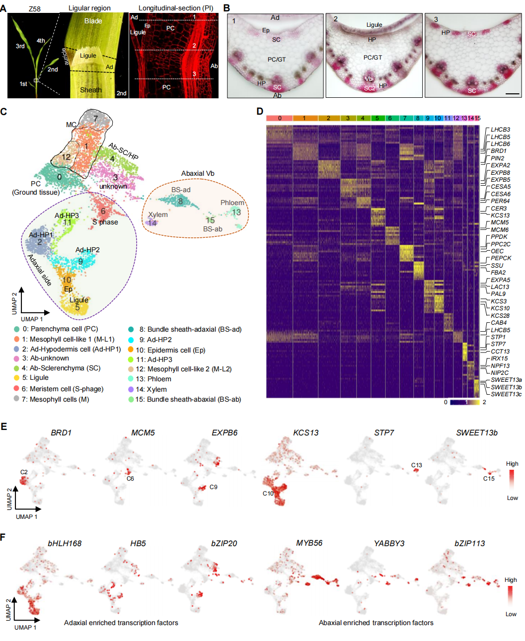 葉片角度(Leaf Angle, LA)是影響玉米種植密度和產(chǎn)量的關(guān)鍵因素。然而,調(diào)控葉片角度形成的機制尚不清楚。該研究通過對不同玉米自交系的莖葉枕區(qū)域進(jìn)行比較組織學(xué)分析,發(fā)現(xiàn)葉片角度大小顯著受到莖葉枕上表皮韌皮纖維細(xì)胞(SC)的初始伸長和隨后的木質(zhì)化的影響。通過批量和單細(xì)胞核RNA測序,生成了莖葉枕區(qū)域的全面轉(zhuǎn)錄組圖譜,并鑒定了許多可能影響其特化為SC的下皮細(xì)胞富集基因。