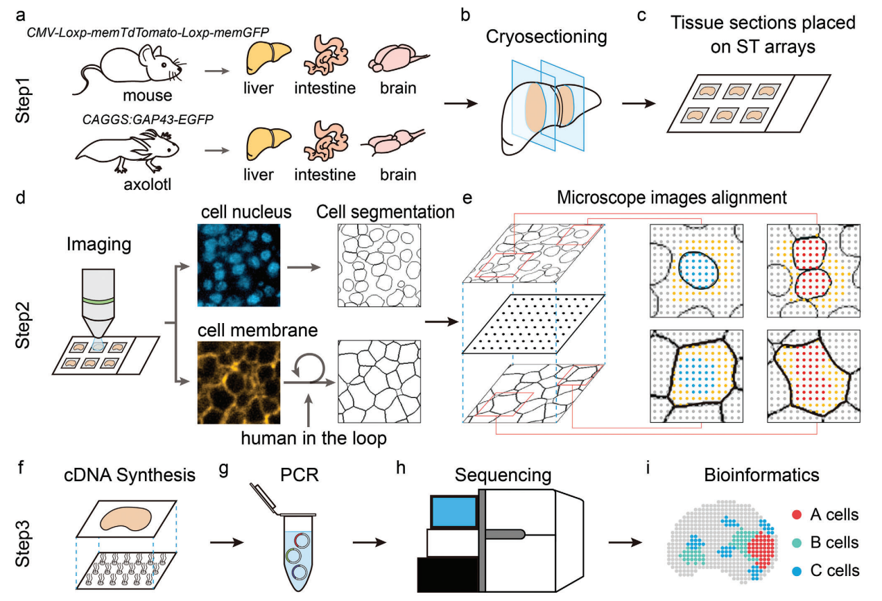 該研究提出了一種新的細(xì)胞邊界定義方法:利用基因編碼的熒光蛋白對細(xì)胞膜進(jìn)行標(biāo)記,從而能夠在組織切片上精確定位細(xì)胞內(nèi)的測序位點和轉(zhuǎn)錄本。與基于細(xì)胞核的方法相比,這種基于細(xì)胞膜的方法顯著增加了捕獲的基因數(shù)量,小鼠和墨西哥鈍口螈肝臟中基因數(shù)量分別增加了67%和119%。