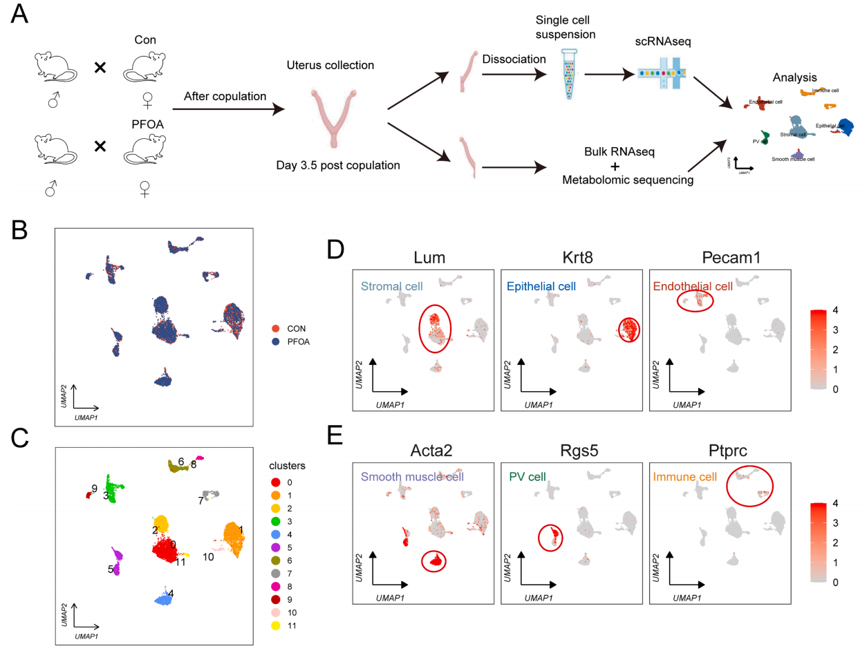 該研究通過小鼠模型,研究了低劑量PFOA暴露對子宮內(nèi)膜容受性的影響。結(jié)果表明,PFOA暴露顯著損害了子宮內(nèi)膜容受性,導(dǎo)致胚胎著床率顯著下降。利用單細(xì)胞RNA測序技術(shù),研究者全面分析了PFOA破壞子宮內(nèi)膜上皮細(xì)胞功能和發(fā)育的具體機制。值得注意的是,研究者發(fā)現(xiàn)ANGPTL(血管生成素樣)信號通路失調(diào),這一通路對于子宮內(nèi)膜基質(zhì)細(xì)胞和上皮細(xì)胞之間的通信至關(guān)重要,最終導(dǎo)致胚胎著床失敗。這些發(fā)現(xiàn)為PFOA的生殖毒性提供了新的見解,并強調(diào)了針對環(huán)境污染物相關(guān)不孕癥治療干預(yù)的潛在靶點。