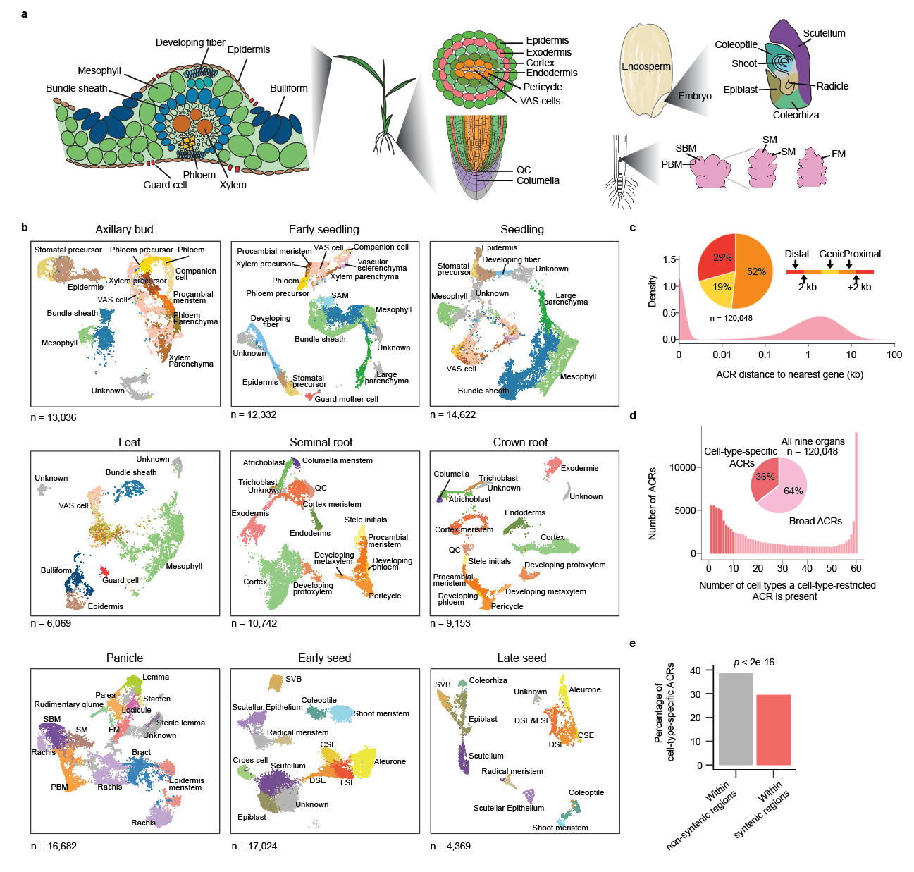 ② 該研究構(gòu)建了一個全面的水稻(Oryza sativa)染色質(zhì)可及性單細(xì)胞圖譜,整合了來自103,911個細(xì)胞核、代表126種離散細(xì)胞狀態(tài)的九個不同器官的數(shù)據(jù)。通過比較基因組學(xué),分析了水稻與另外四種禾本科植物(玉米?Zea mays、高粱?Sorghum bicolor、黍?Panicum miliaceum?和?Urochloa fusca)中57,552個細(xì)胞核的細(xì)胞類型分辨染色質(zhì)可及性之間的差異。