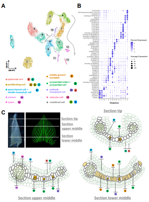 ③ 該研究描繪了從發(fā)展中的玉米原基尖端向下的潛在維管束鞘細(xì)胞亞群和不同層次的葉肉細(xì)胞。