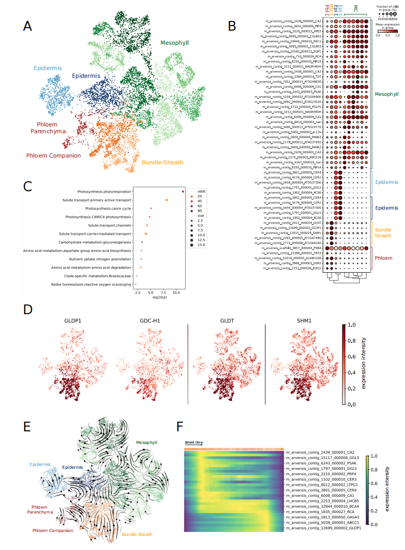 ② 該研究利用最近在單細(xì)胞轉(zhuǎn)錄組測序方面的進(jìn)展,更好地理解新的細(xì)胞特化如何影響相互關(guān)聯(lián)的途徑。研究人員為具有C3-C4中間特征的堇娘芥(Moricandia arvensis)生成了單細(xì)胞核RNA測序數(shù)據(jù)集,并將其與公開可用的C3擬南芥(Arabidopsis thaliana)葉組織的單細(xì)胞轉(zhuǎn)錄組進(jìn)行了比較,還通過免疫金標(biāo)記技術(shù)結(jié)合電子顯微鏡獨(dú)立驗證了選定光呼吸蛋白的定位。