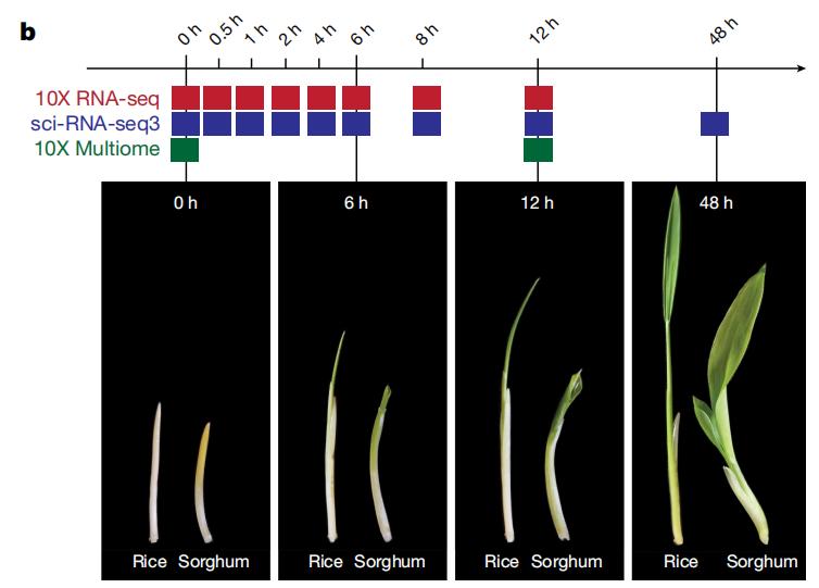 單細(xì)胞核轉(zhuǎn)錄組:水稻和高粱幼苗暗生長5天后,在光周期(12h光/12h暗)中采集0h(暗)、0.5h、1h、2h、4h、6h、8h、12h、48h共9個時間點(diǎn)的地上組織。總計水稻190,569個核、高粱265,701個核。