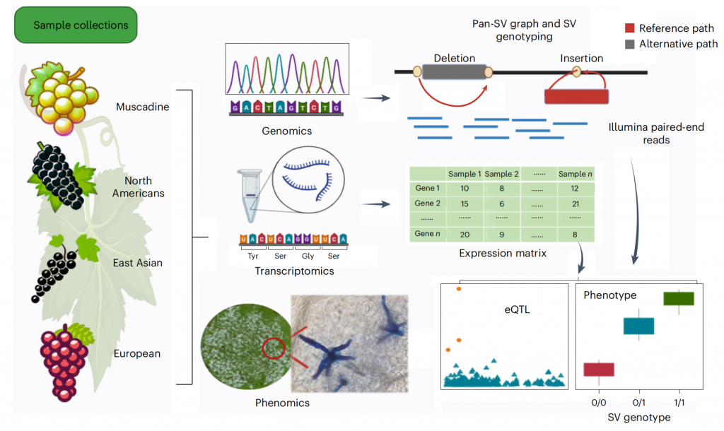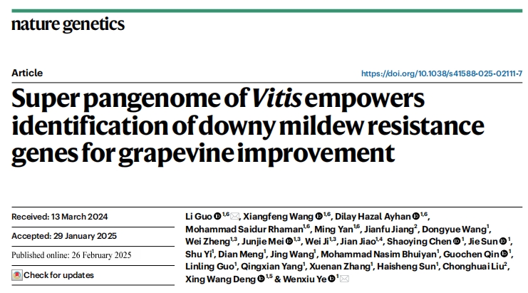 2025年02月26日,濰坊現(xiàn)代農(nóng)業(yè)山東省實(shí)驗(yàn)室、北京大學(xué)現(xiàn)代農(nóng)業(yè)研究院葉文秀研究員和郭立研究員團(tuán)隊(duì)在國(guó)際期刊《自然-遺傳學(xué)(Nature Genetics)》上在線發(fā)表了題為Super pangenome of Vitis?empowers identification of downy mildew resistance genes for grapevine improvement的研究成果。作為葡萄科研領(lǐng)域里程碑式的重大突破,繪制了涵蓋葡萄屬的歐亞、北美和東亞世界三大種群的72個(gè)葡萄種質(zhì)材料的單倍型超級(jí)泛基因組圖譜,揭示葡萄屬豐富遺傳多樣性和雜交歷史,基于葡萄多組學(xué)數(shù)據(jù),挖掘到葡萄霜霉病抗性相關(guān)遺傳變異和抗病基因,加速葡萄精準(zhǔn)分子育種,開啟葡萄種質(zhì)創(chuàng)新和利用新時(shí)代。百邁客生物為該研究提供了基因組、hic、轉(zhuǎn)錄組等測(cè)序服務(wù)。