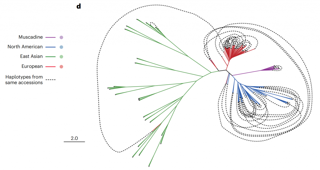 鑒于葡萄基因組因頻繁雜交而具有的高度雜合性,單倍型基因組不僅能精確解析雜合區(qū)域序列,而且對(duì)分析葡萄的育種歷史也至關(guān)重要。該研究構(gòu)建了單倍型系統(tǒng)發(fā)育進(jìn)化樹,揭示了葡萄屬植物復(fù)雜的育種歷史和豐富的遺傳多樣性。結(jié)果顯示,北美和歐洲品種存在較多內(nèi)部雜交,而東亞品種的內(nèi)部雜交較少,跨大洲雜交事件有限(圖2)。特別是東亞葡萄極少被開發(fā)的遺傳多樣性,表明了其潛在的巨大育種價(jià)值。此次發(fā)布的東亞野生葡萄基因組為葡萄遺傳育種研究提供了強(qiáng)有力的資源支持。